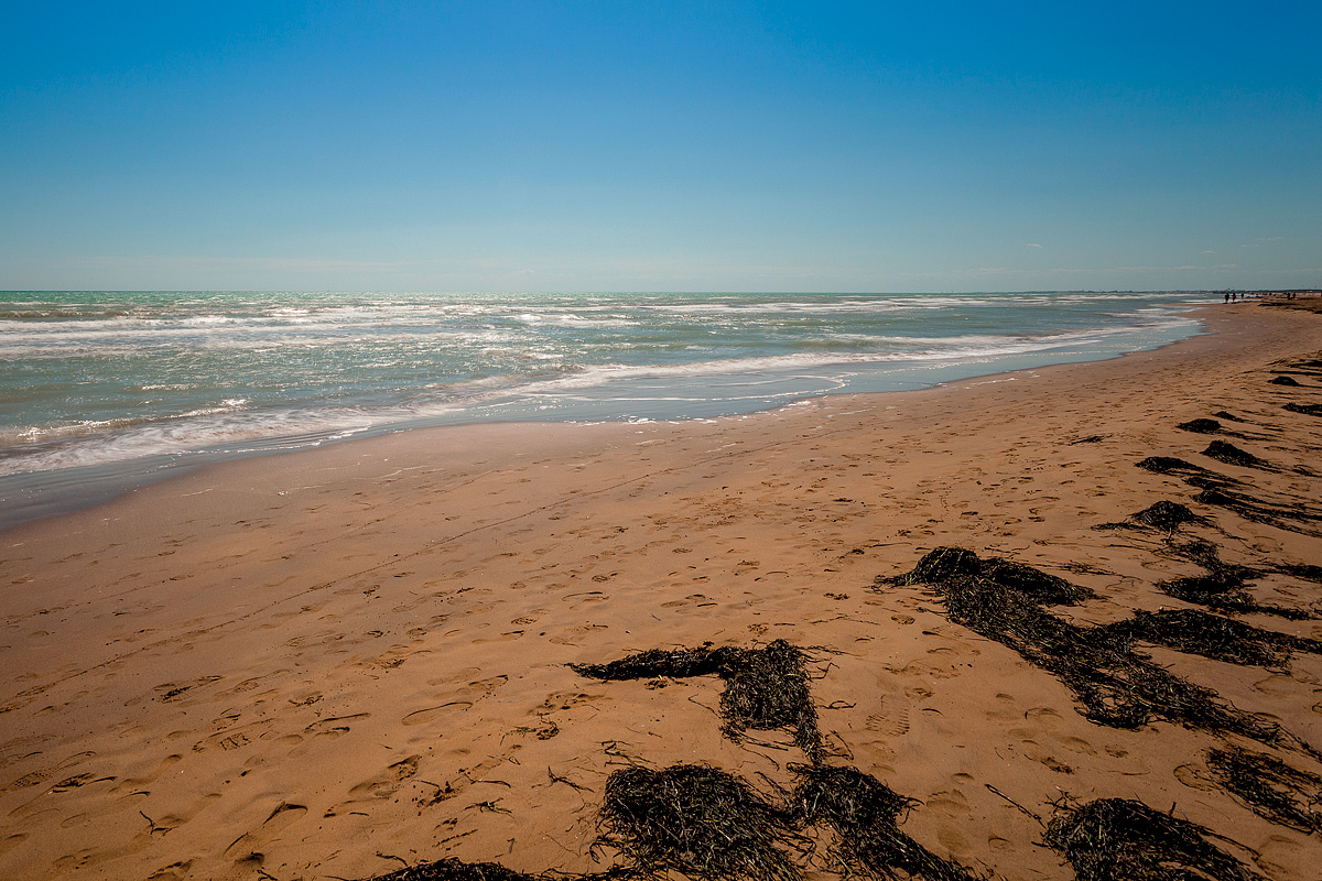 Místní moře je čisté, u břehu však může být zkaleno zvířeným pískem. Po převážnou většinu roku je i zcela klidné, není však vhodné pro potápění a nežijí v něm nebezpeční živočichové. Pláž je tvořena výhradně velmi jemným světlým pískem, je dlouhá 11 kilometrů a místy široká až 200 metrů, i v nejužších místech však okolo 100 metrů. Vyhlášená je zejména díky pozvolnému a bezpečnému vstupu do moře, absolutně ideální je především pro malé děti, zdravotně postižené a neplavce. Pláž je jak veřejná, tak i soukromá, za poplatek si lze pronajmout plážový servis. Neplacené volné pláže jsou vytěsněny až do zcela okrajových částí letoviska, ale ležet zdarma je povoleno i v části širokého úseku mezi mořem a první řadou slunečníků pláží soukromých. Pro použití slunečníků a lehátek vlastních je pak vymezen prostor za řadami slunečníků placených. Pláž je každodenně udržována, k dispozici jsou sprchy a WC, hřiště pro plážový volejbal a fotbal, půjčovny vodních šlapadel i dětské atrakce v podobě houpaček, prolézaček atd. Bibione se pyšní též několika oceněními „modrou vlajkou“, které je udělováno mezinárodní neziskovou organizací Nadace pro ekologickou výchovu (FEE) za čistotu pláží.