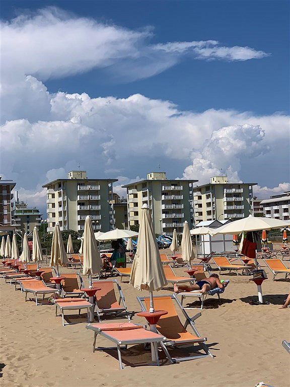 plážový servis sestává ze slunečníku, lehátka a plážového křesla či slunečníku a 2 lehátek ; nabízen je na převážné většině pláží v Bibione