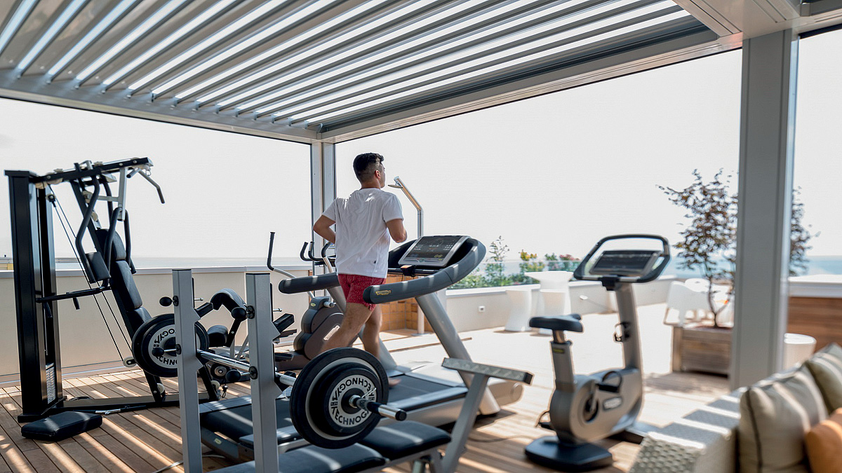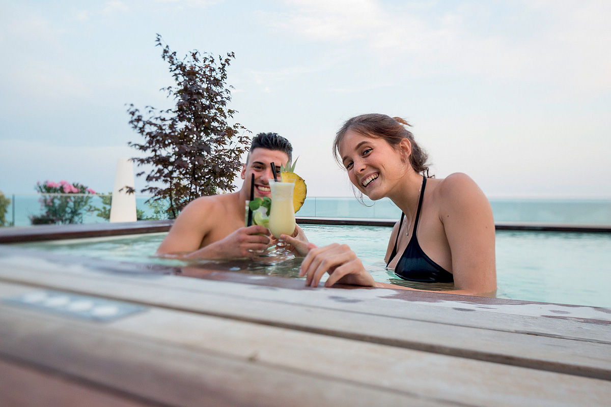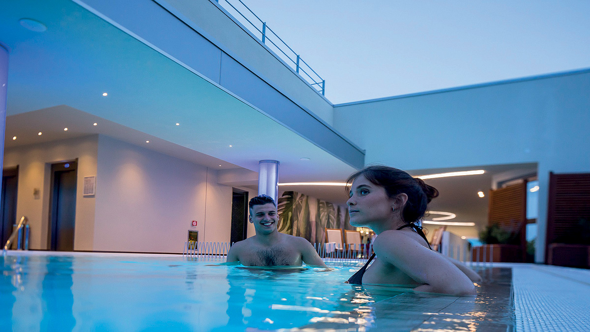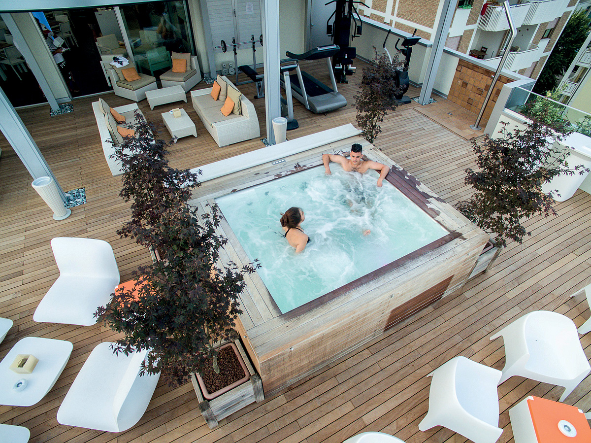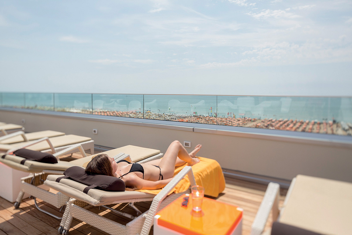 vyhřívaný venkovní bazén na střeše hotelu 60 m² s dětským bazénkem, vířivka (1 vstup zdarma, další za poplatek), sluneční terasa s lehátky a slunečníky (v případě nepřízně počasí krytá), wellness centrum (posilovna, relaxační koutek s lehátky; solárium*, masáže* a široká nabídka kosmetických služeb* a zdravotních kúr*, zdarma k dispozici též některé nápoje), plážový servis na pláži v ceně (altán se dvěma křesílky, lehátkem a stolkem); půjčovna jízdních kol pro děti i dospělé
