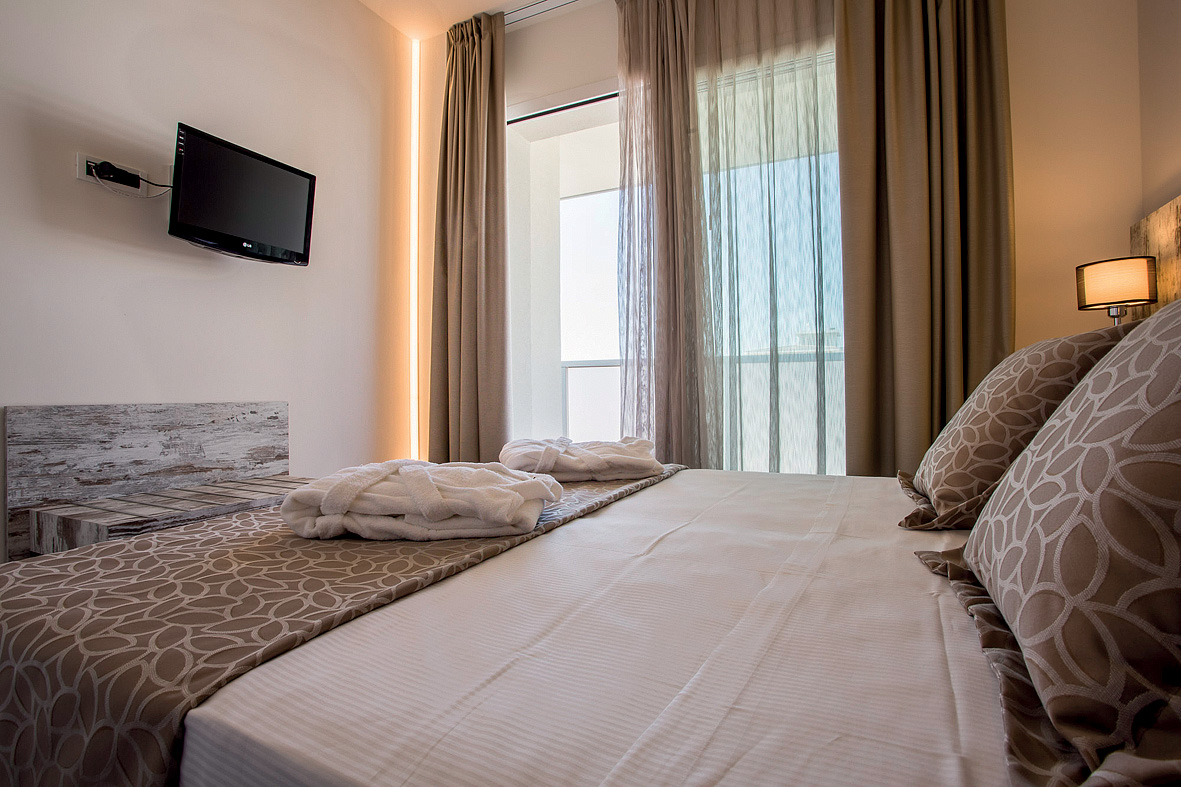 klimatizace, wi-fi připojení k internetu, LCD TV sat., telefon, trezor, fén, nápojová lednička (minibar); u pokojů Family Junior Suite - župan, pantofle a plážová taška