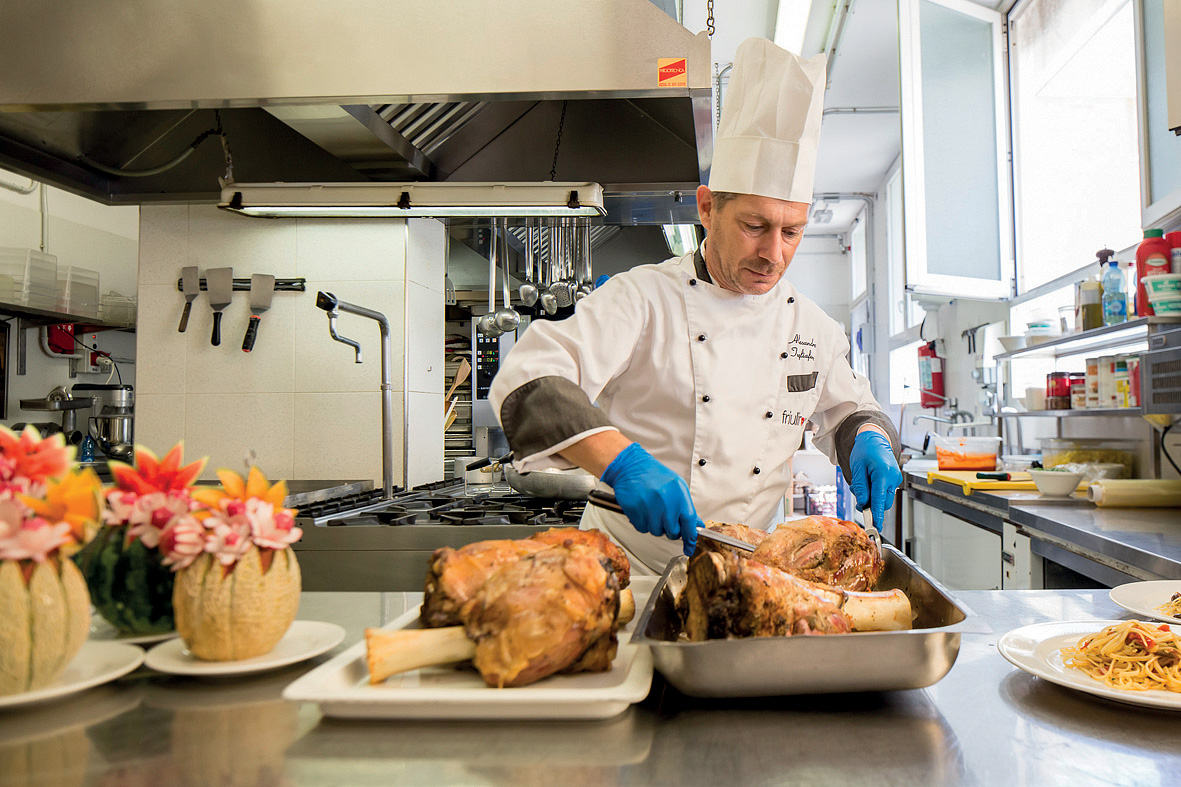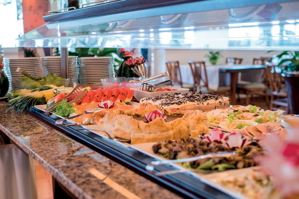 formou bohatých švédských stolů (studené i teplé předkrmy, 3 až 5 hlavních jídel s přílohou), široká nabídka zeleniny, ovoce, dezertů atd.; ostatní nápoje za poplatek