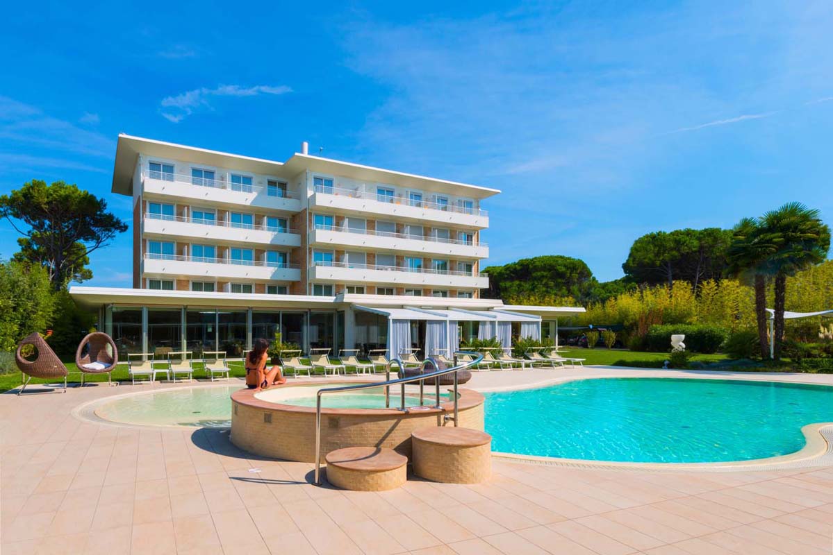 bazén s vířivkou, sluneční terasa s lehátky, zahrada, plážový servis (1 slunečník, 2 lehátka a plážové osušky / pokoj) v ceně, půjčovna kol