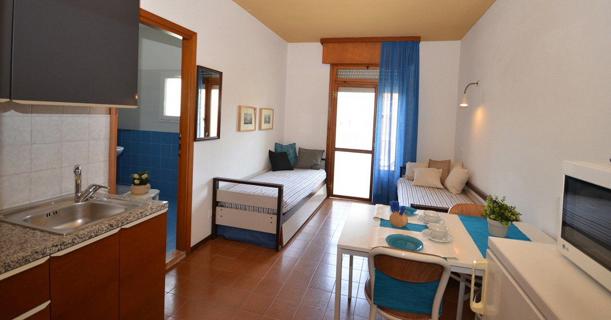 21 m² obývací pokoj s kuchyňským koutem, rozkládacím gaučem (možno i typ „šuplík“) pro 2 osoby a rozkládacím gaučem pro 1 osobu či se 3 rozkládacími gauči pro 1 osobu, sociální zařízení se sprchou, balkon