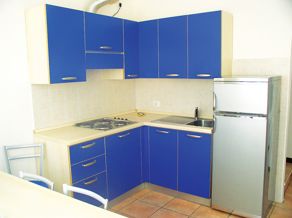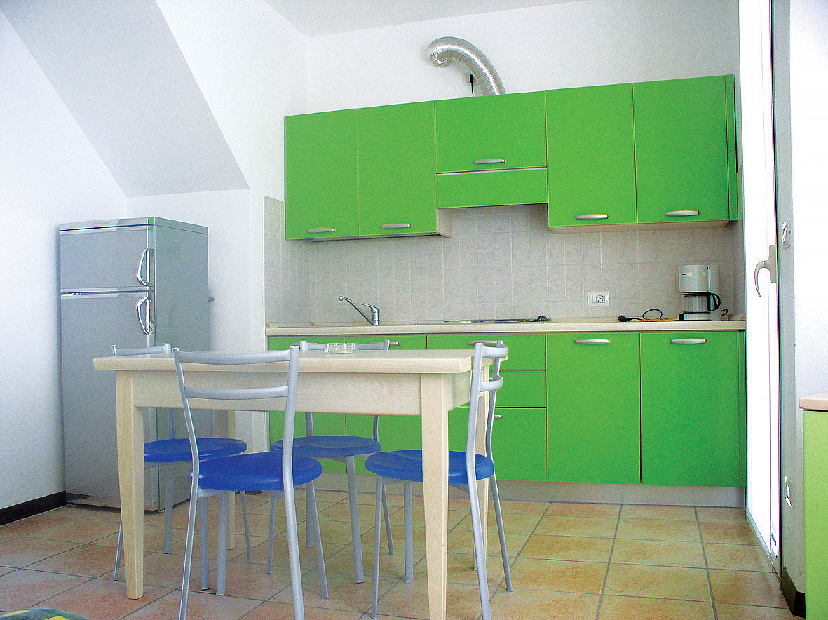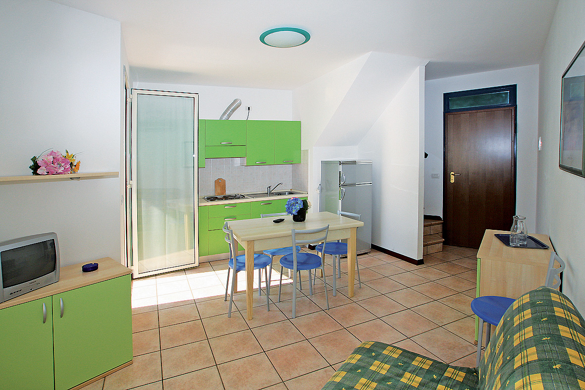 bilo 5 - 30 až 35 m² - přízemí: obývací pokoj s kuchyňským koutem a rozkládacím gaučem pro 2 osoby, terasa a předzahrádka; 1. patro: 1 ložnice s manželskou postelí a 1 samostatným lůžkem, sociální zařízení se sprchou, balkon