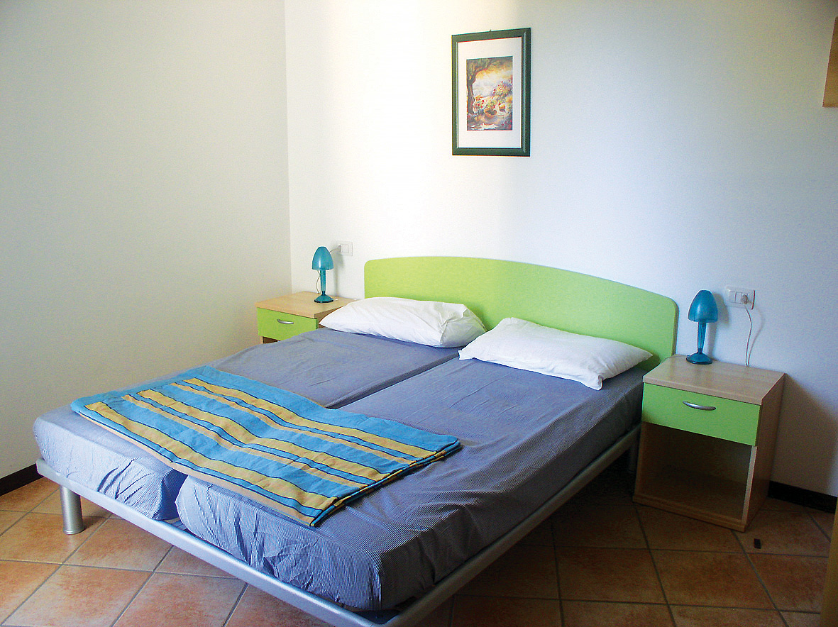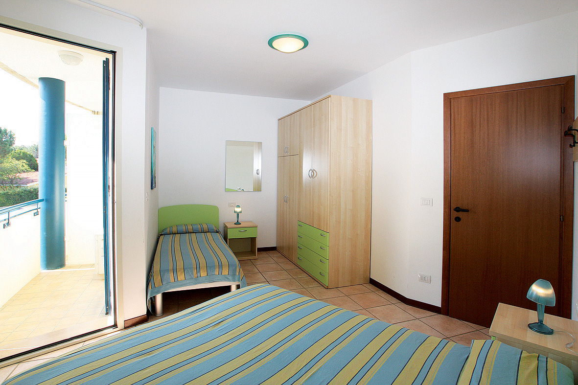 trilo 6 - 45 m² - přízemí: obývací pokoj s kuchyňským koutem a rozkládacím gaučem pro 1 osobu, sociální zařízení (jen umyvadlo a toaleta), terasa a předzahrádka; 1. patro: 1 ložnice s manželskou postelí a 1 samostatným lůžkem, 1 ložnice se 2 samostatnými lůžky, sociální zařízení se sprchou, zpravidla balkon