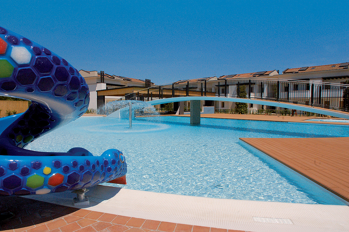 bazén cca 400 m² s postupně se svažujícím dětským bazénem (cca 200 m²), vířivkou (cca 100 m²), skluzavkou a lehátky