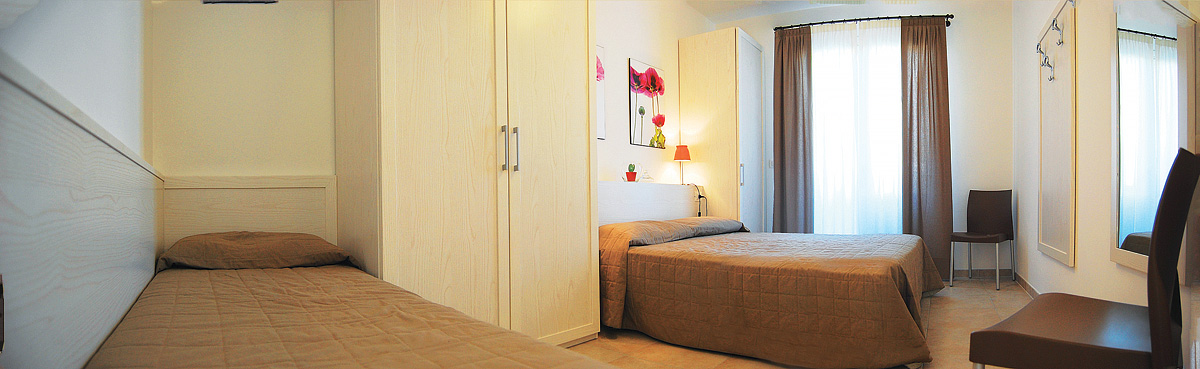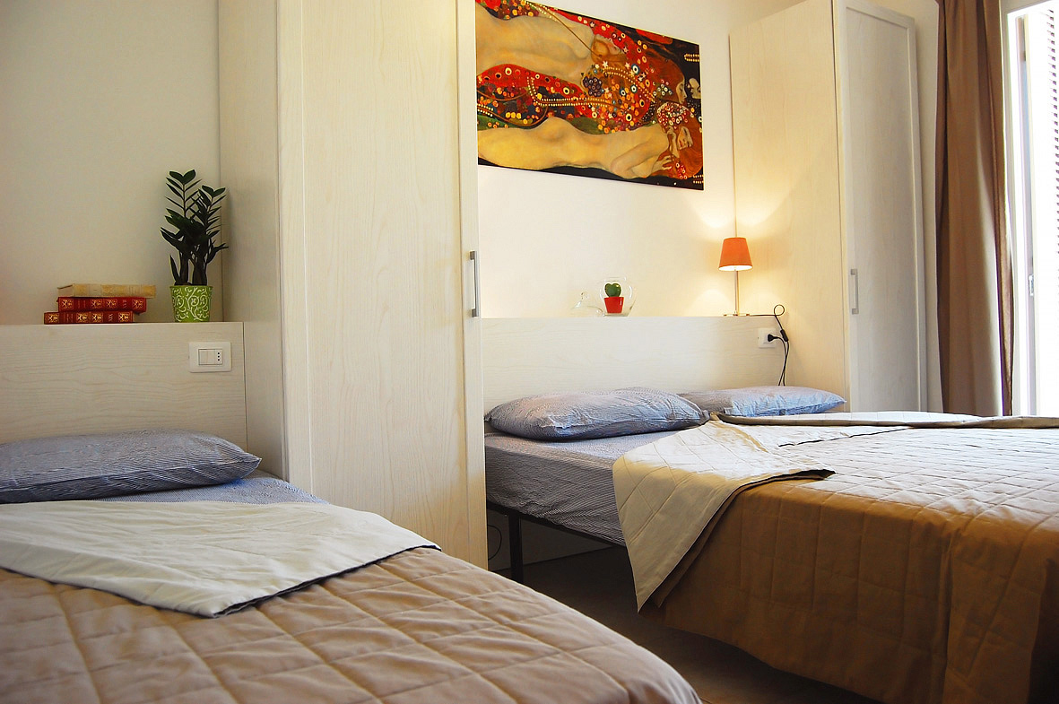 45 až 50 m² - 1 ložnice s manželskou postelí a 1 samostatným lůžkem, 1 malá ložnice s 1 samostatným lůžkem, obývací pokoj s kuchyňským koutem a rozkládacím gaučem pro 2 osoby, sociální zařízení se sprchou, terasa s předzahrádkou; apartmány orientované na bazén označeny typologií trilo 6 - bazén / trilo 6° - bazén