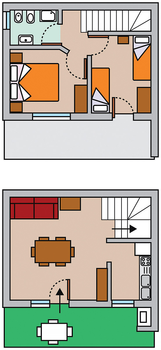 přízemí: obývací pokoj s rozkládacím gaučem pro 1 či 2 osoby (možnost typ "šuplík"), samostatný kuchyňský kout či kuchyňský kout v rámci obývacího pokoje,1 malá ložnice s 1 samostatným lůžkem, terasa a předzahrádka; 1. patro: 1 ložnice s manželskou postelí, 1 ložnice se 2 samostatnými lůžky či palandou, sociální zařízení se sprchou, balkon