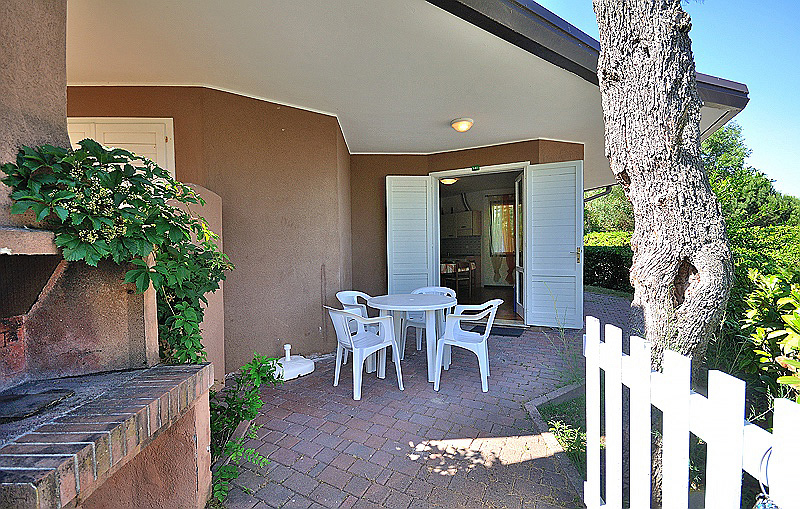 25 m² - obývací pokoj s kuchyňským koutem a 2 rozkládacími gauči pro 2 osoby, sociální zařízení se sprchou, menší terasa a předzahrádka