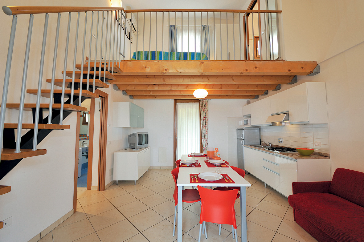 50 až 55 m² - 1. patro: obývací pokoj s kuchyňským koutem a rozkládacím gaučem pro 1 osobu, 1 ložnice s manželskou postelí a 1 samostatným lůžkem, 1 ložnice se 2 samostatnými lůžky, sociální zařízení, 2 balkony (jeden s krbem); podkroví: 1 ložnice s manželskou postelí (nemá dělící stěny) a sociální zařízení