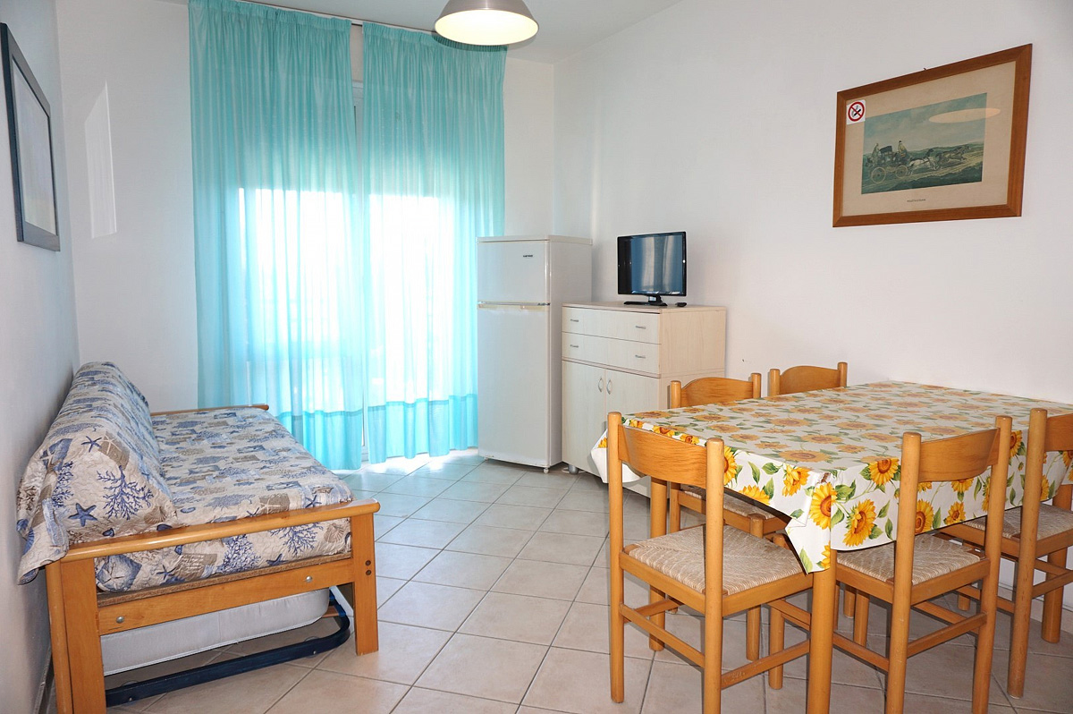 obývací pokoj s kuchyňským koutem, rozkládacím gaučem pro 2 osoby a přistýlkami pro 2 osoby (gauč nebo palanda) či manželskou postelí a rozkládacím gaučem pro 2 osoby, sociální zařízení se sprchou, balkon