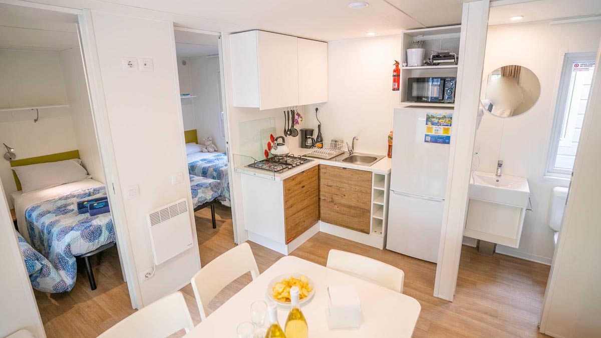 mobilhome Happy superior 4/6 - 29 m² - ložnice s manželskou postelí, 2 ložnice se 2 samostatnými lůžky, obývací část s kuchyňským koutem, 2x sociální zařízení se sprchou, zastřešená dřevěná terasa