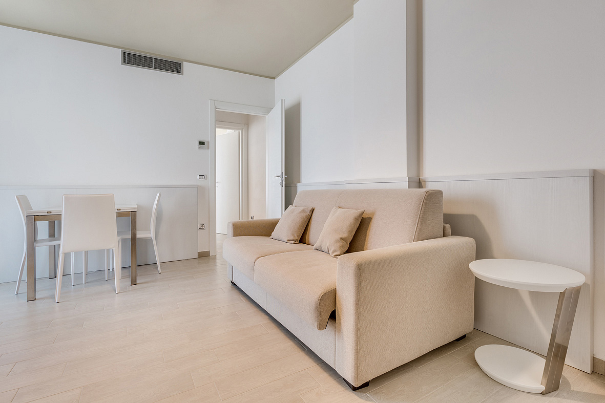 Suite 4 - 35m² – 1 ložnice s manželskou postelí, obývací pokoj s rozkládacím gaučem pro 2 osoby, sociální zařízení se sprchou, balkon