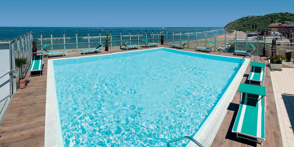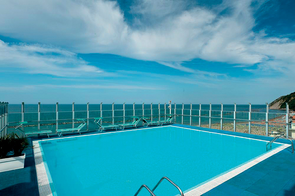 venkovní bazén s lehátky a vířivkou na střeše hotelu