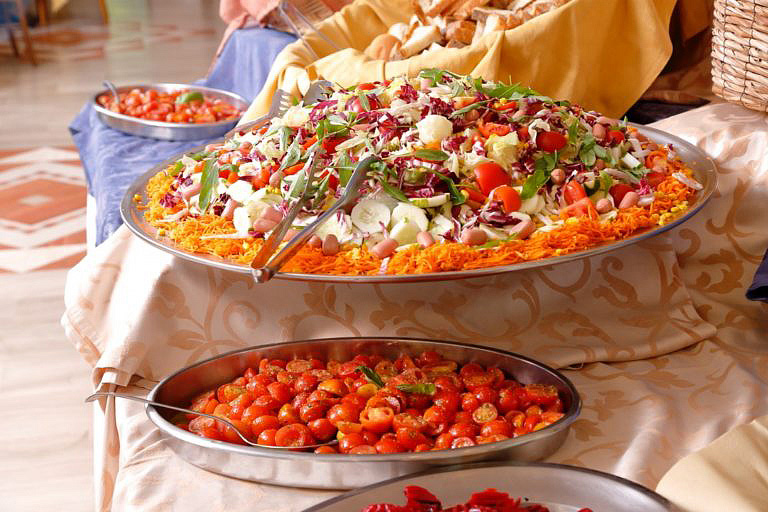 bufet s výběrem z 2 až 3 zpravidla teplých předkrmů a hlavních jídel, salátů, příloh a dezertu, čepované víno, nealkoholické nápoje a voda; ostatní nápoje za poplatek