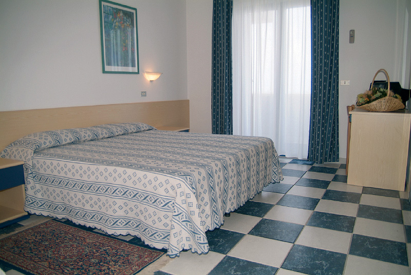 pokoj s manželskou postelí či 2 samostatnými lůžky, sociální zařízení se sprchou, balkon s výhledem na moře; 3. lůžko pevné či formou přistýlky, 4. lůžko formou palandy; pokoje se nachází v hotelové budově