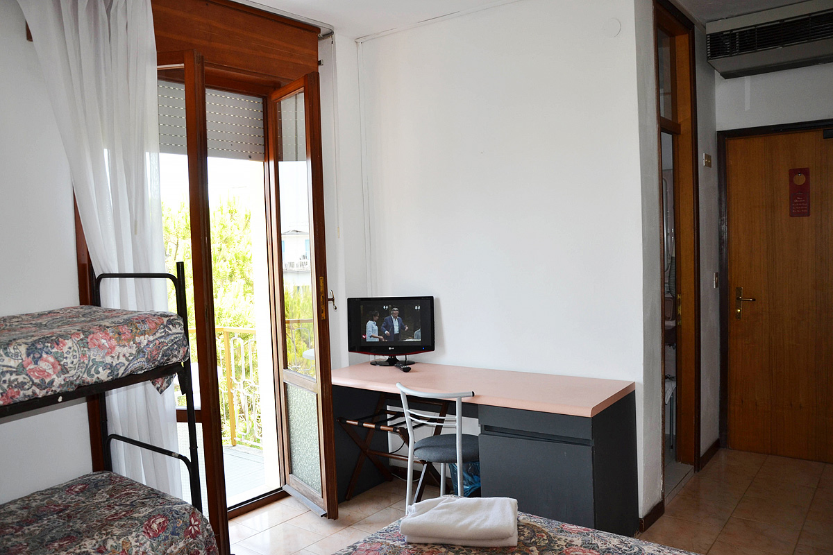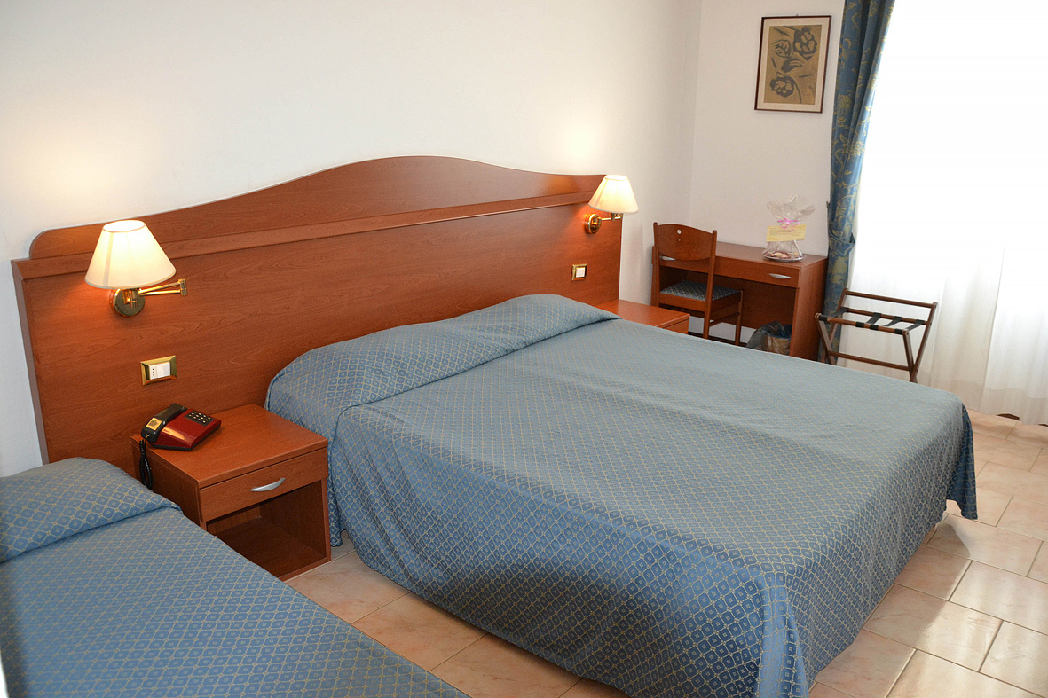 pokoj s manželskou postelí či 2 samostatnými lůžky, sociální zařízení se sprchou či vanou, balkon s přímým výhledem na moře; 3. a 4. lůžko formou přistýlky či palandy; pokoje se nachází v hotelu Heron