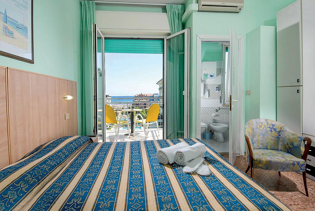pokoj s manželskou postelí či 2 samostatnými lůžky, sociální zařízení se sprchou, balkon; 3. lůžko pevné či 3. a 4. lůžko formou palandy