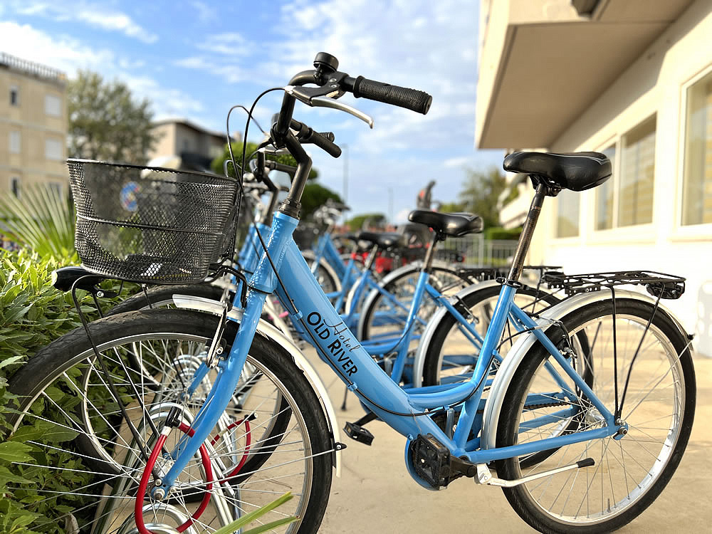 bazén 15 x 8 m s pozvolna se svažujícím dnem, lehátky a slunečníky, půjčovna jízdních kol