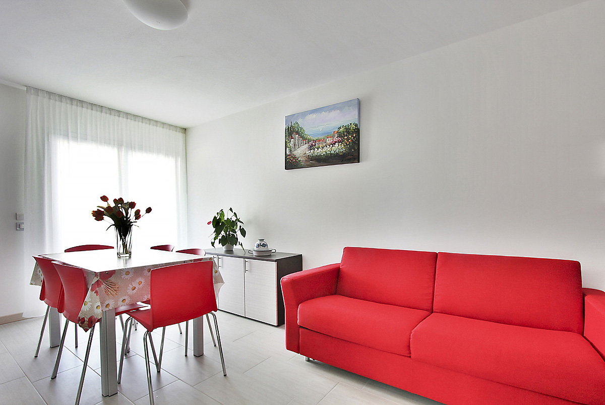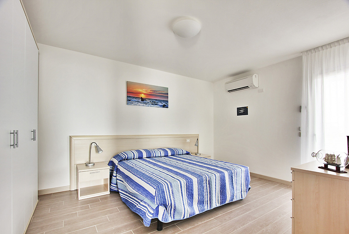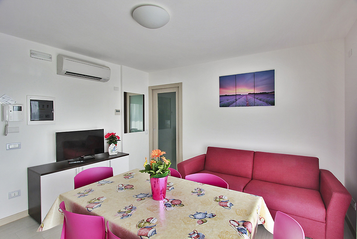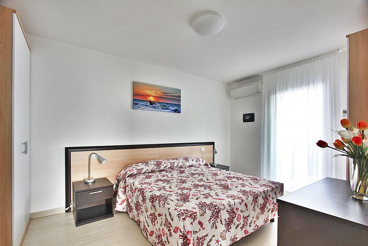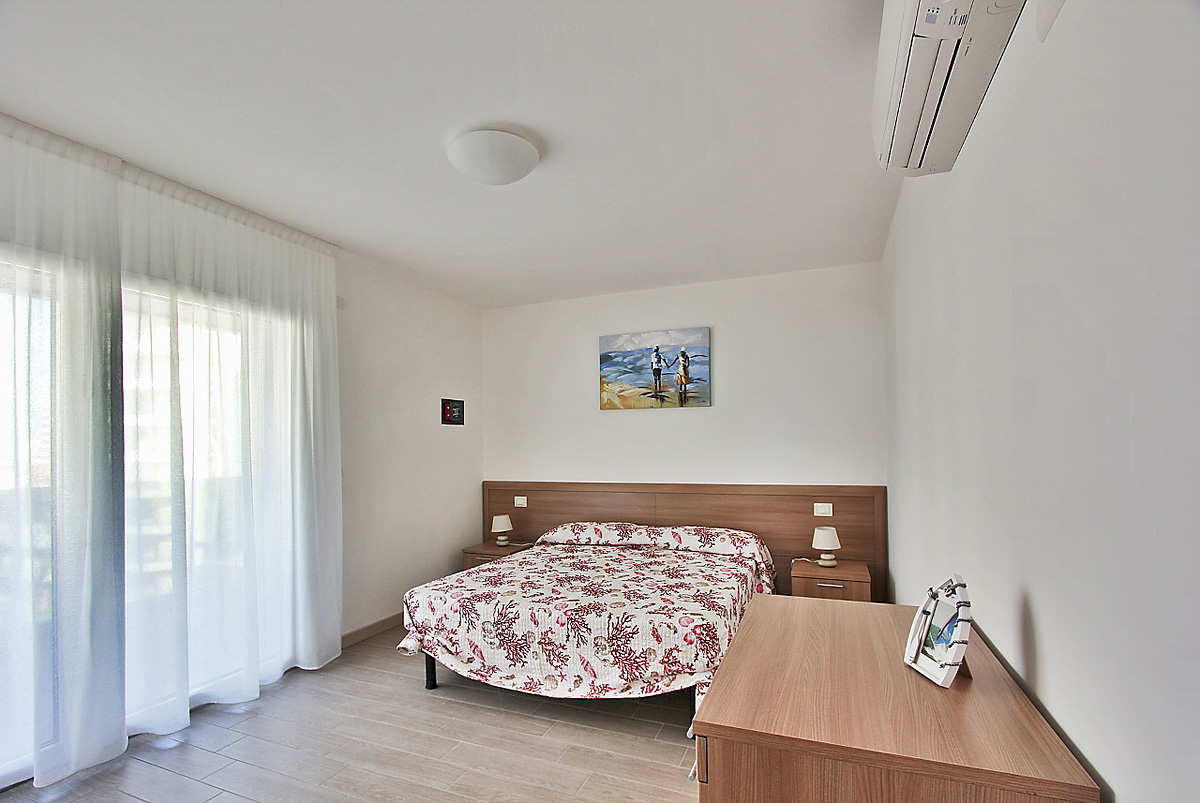 1 ložnice s manželskou postelí, 1 ložnice se 2 samostatnými lůžky či palandou, obývací pokoj s kuchyňským koutem a rozkládacím gaučem (možno i typ "šuplík") pro 2 osoby, sociální zařízení se sprchovým boxem, balkon; typ trilo 6++ se 2 sociálními zařízeními a velkým balkonem s výhledem na lagunu