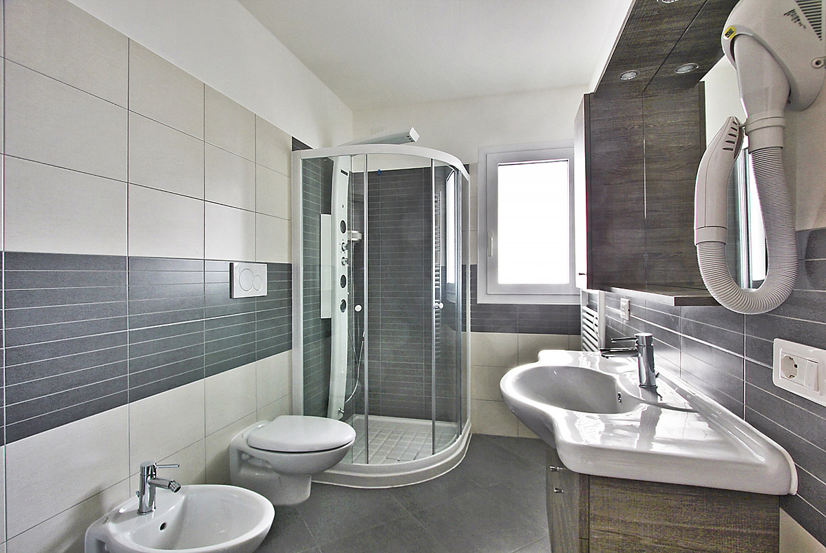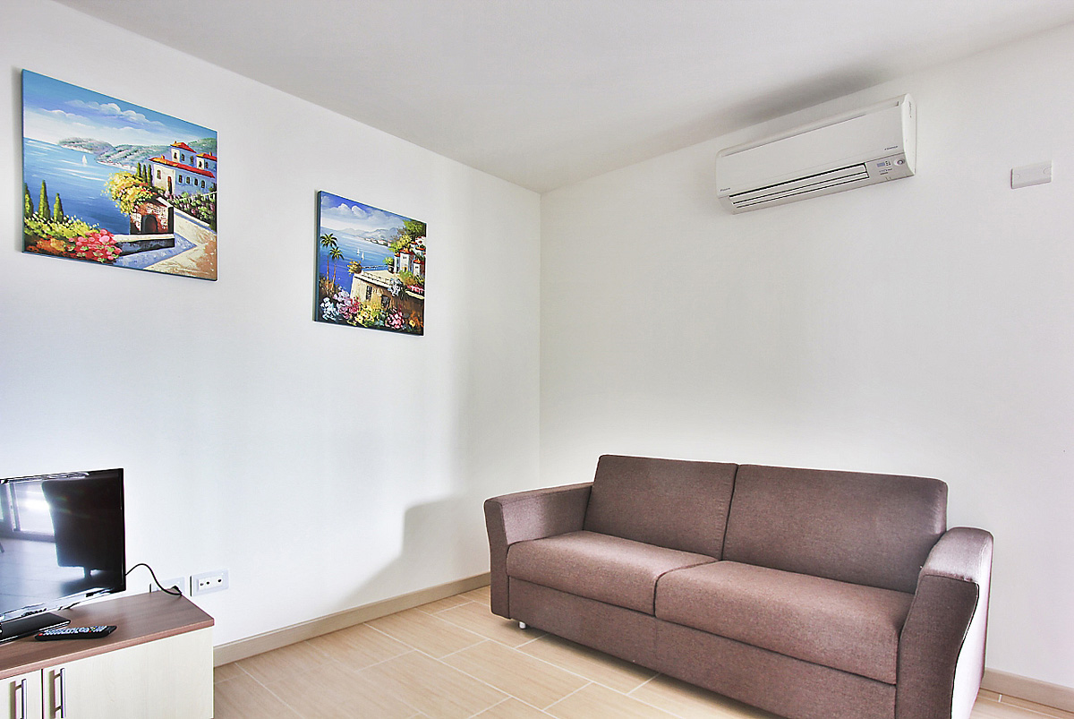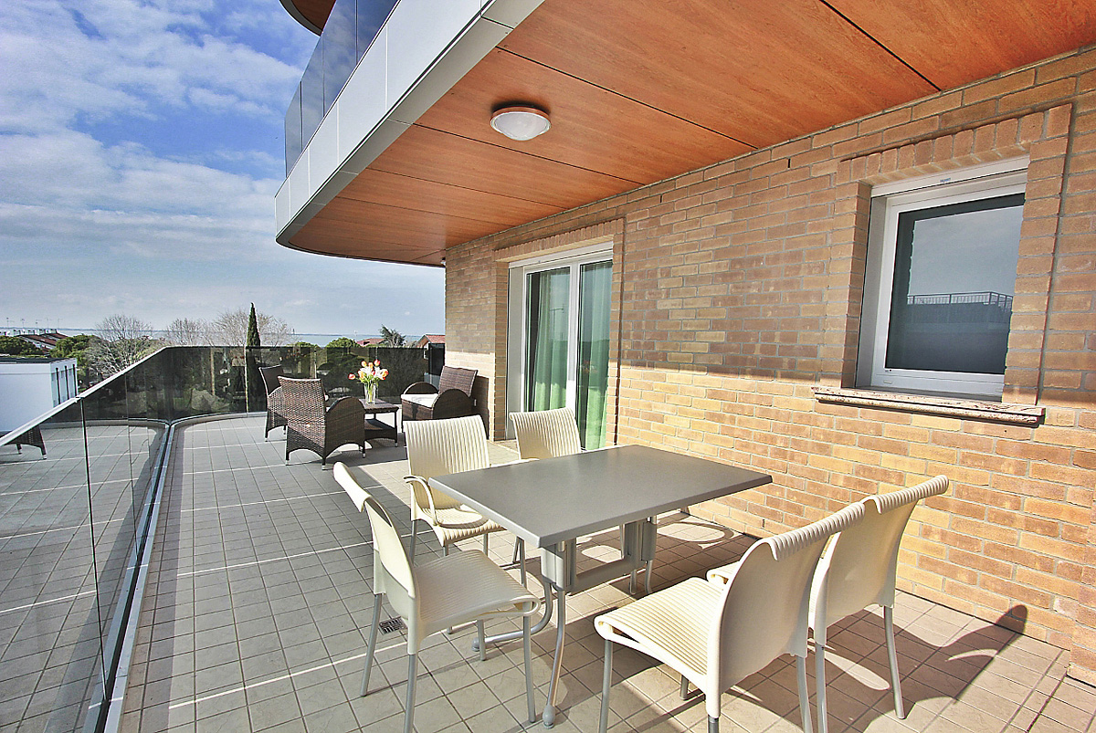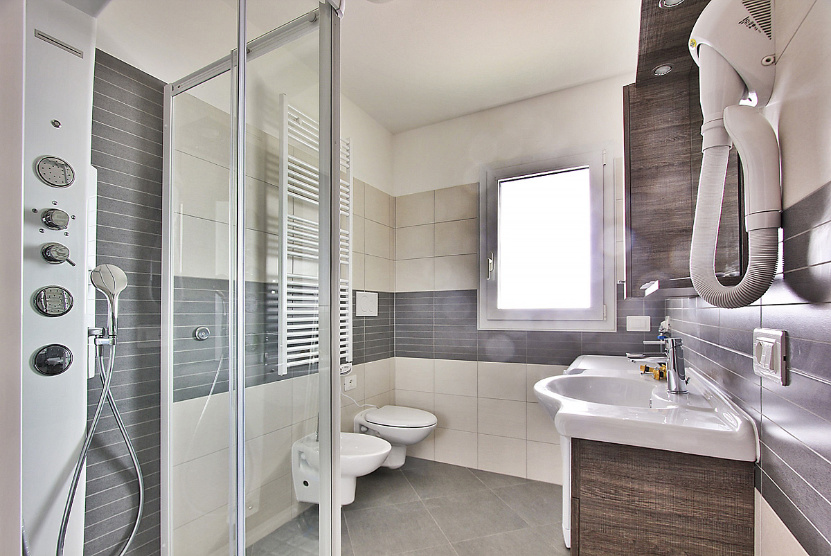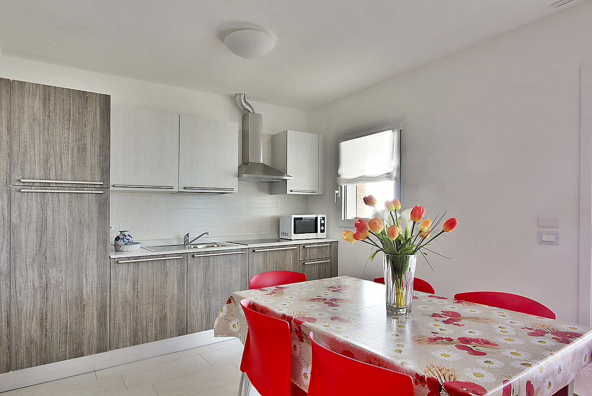 1 ložnice s manželskou postelí, 1 ložnice se 2 samostatnými lůžky či palandou, obývací pokoj s kuchyňským koutem a rozkládacím gaučem (možno i typ "šuplík") pro 2 osoby, sociální zařízení se sprchovým boxem, balkon; typ trilo 6++ se 2 sociálními zařízeními a velkým balkonem s výhledem na lagunu