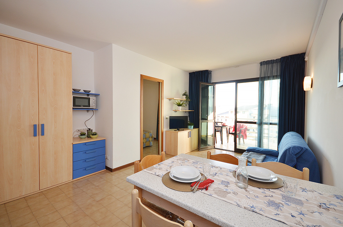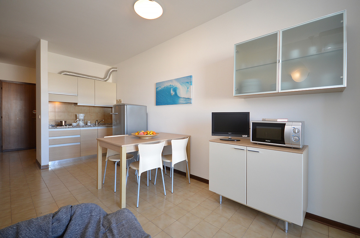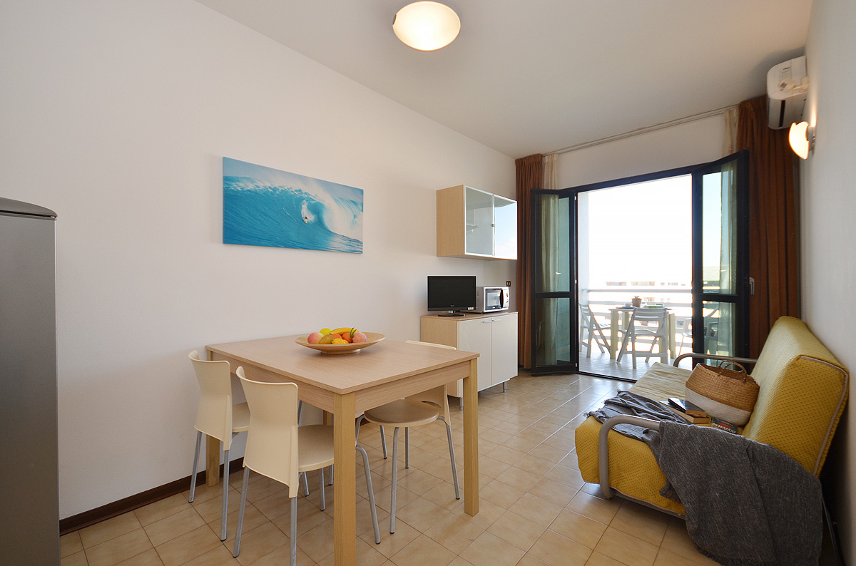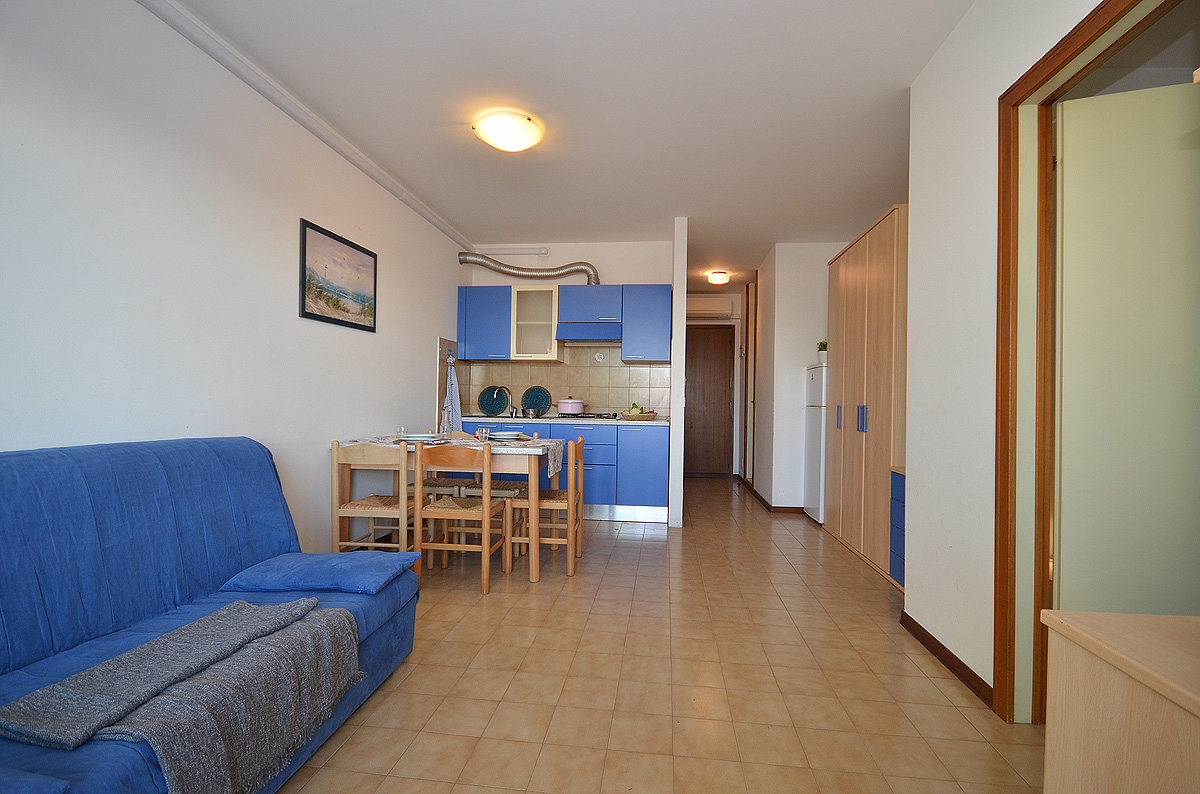 34 m² - 1 ložnice s manželskou postelí a případně jedním samostatným lůžkem v ložnici či obýváku, obývací pokoj s kuchyňským koutem a rozkládacím gaučem pro 2 osoby, sociální zařízení se sprchou, balkon