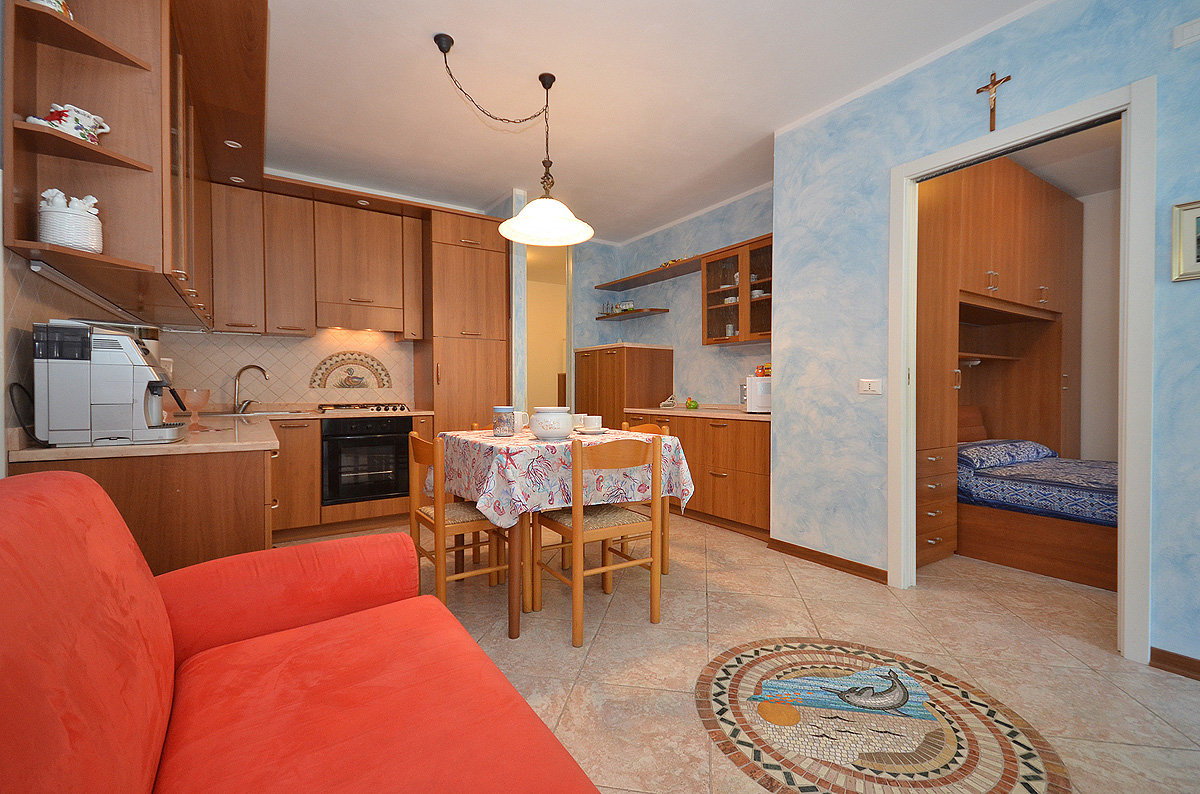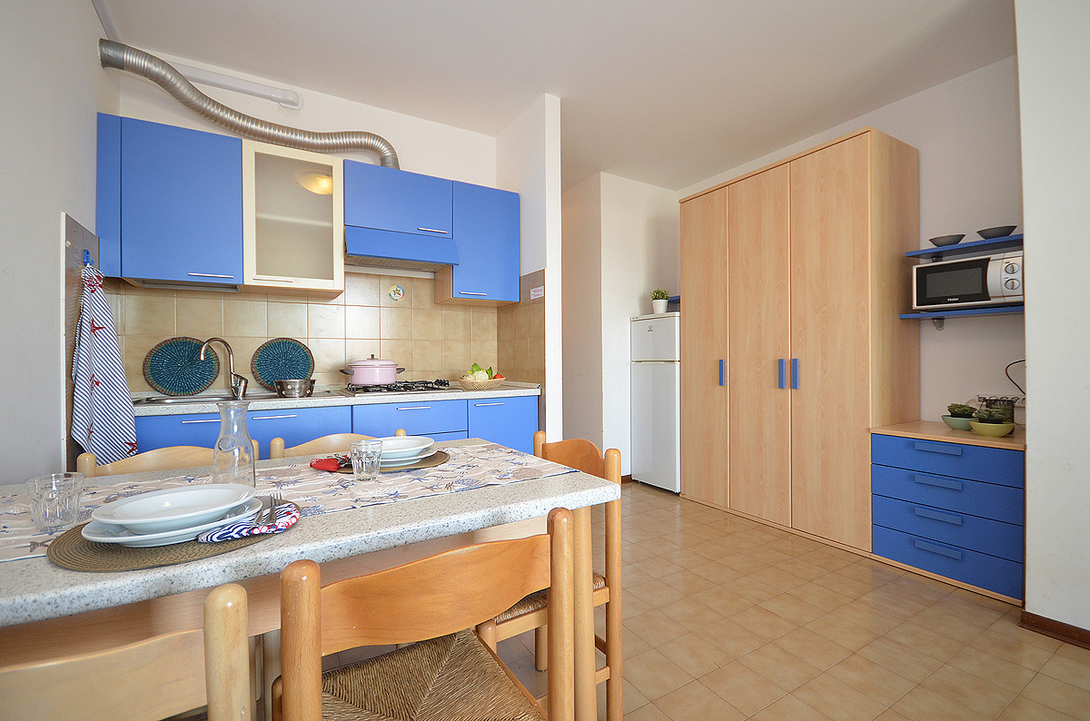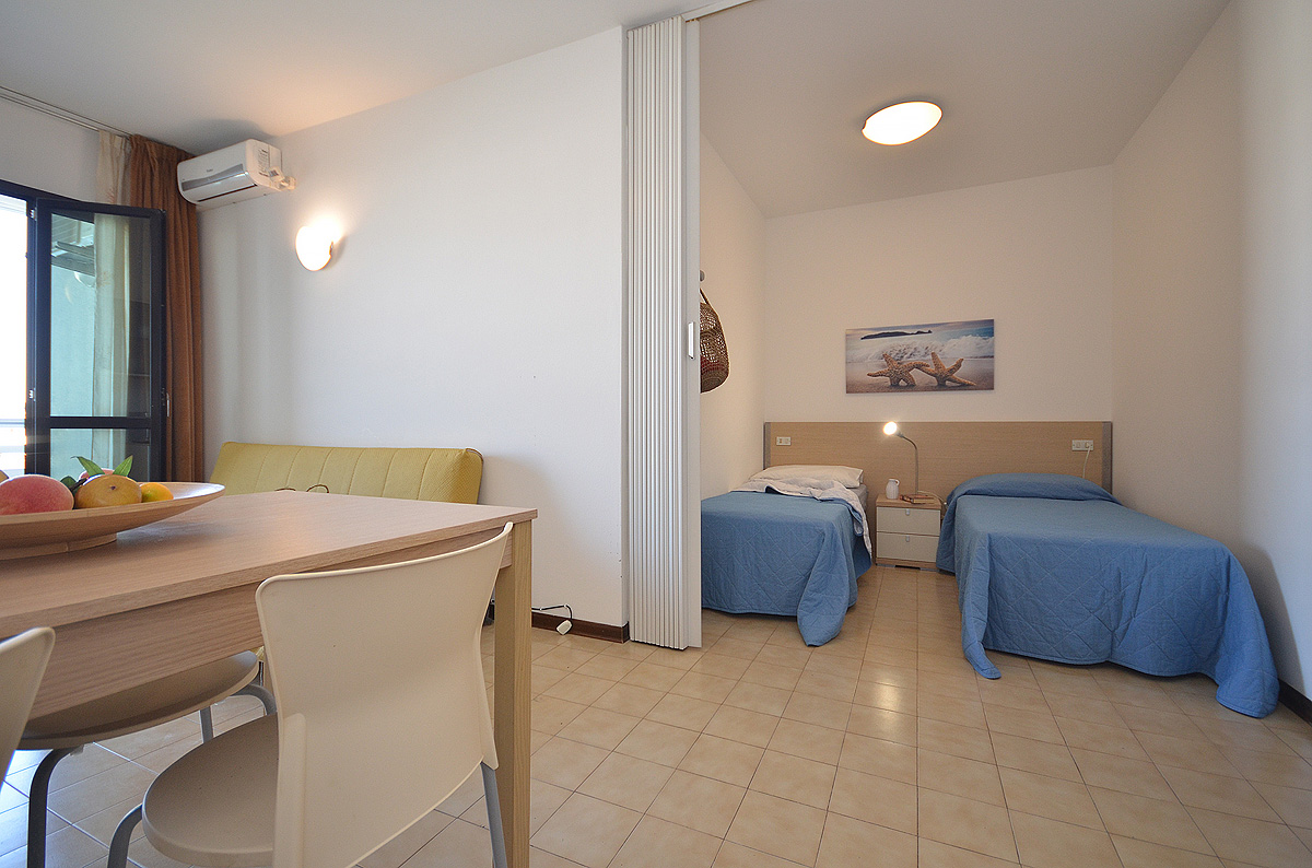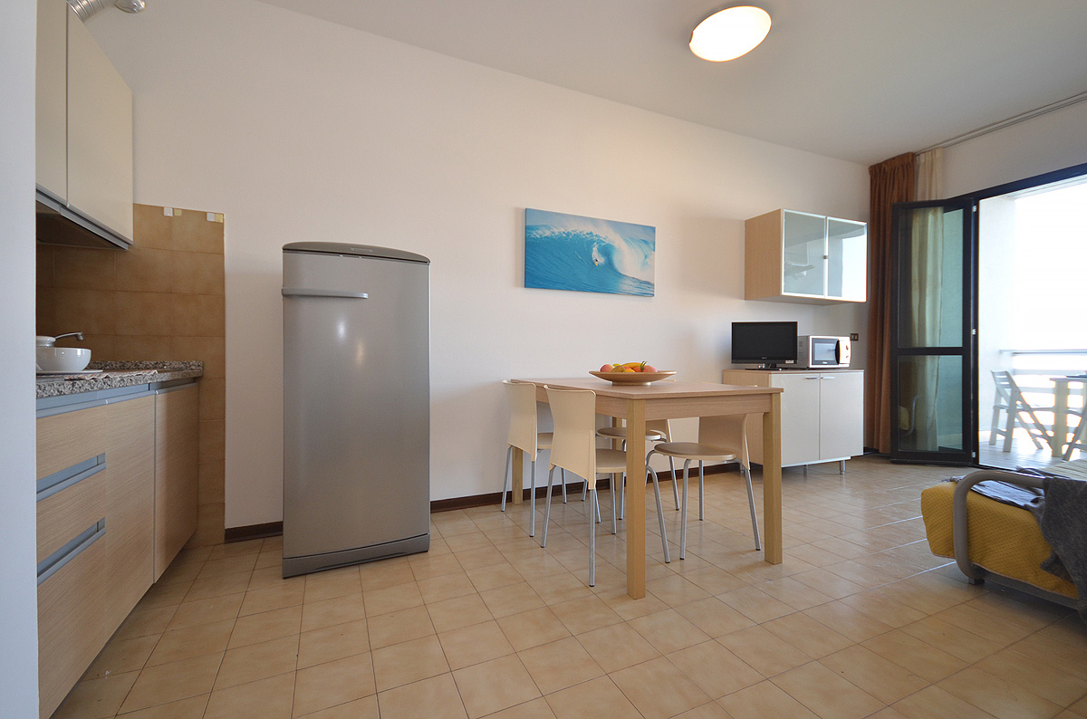 34 m² - 1 ložnice s manželskou postelí a případně jedním samostatným lůžkem v ložnici či obýváku, obývací pokoj s kuchyňským koutem a rozkládacím gaučem pro 2 osoby, sociální zařízení se sprchou, balkon