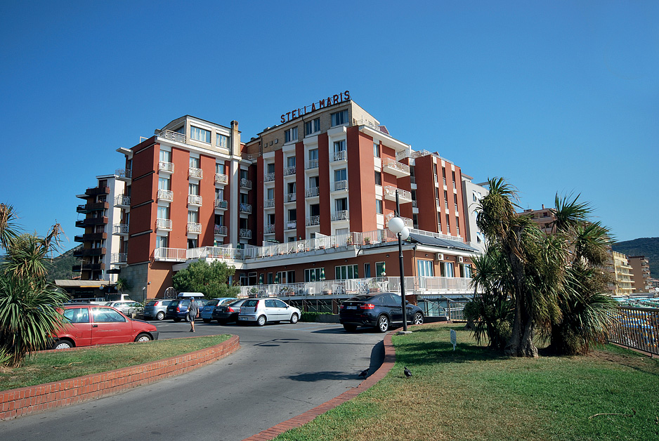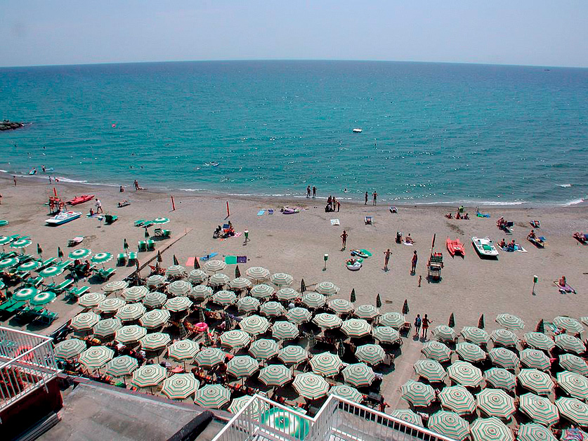 Pietra Ligure, hrubo-písčitá až jemně oblázková pláž s mírně se svažujícím vstupem do moře - 10 m, centrum - 600 m