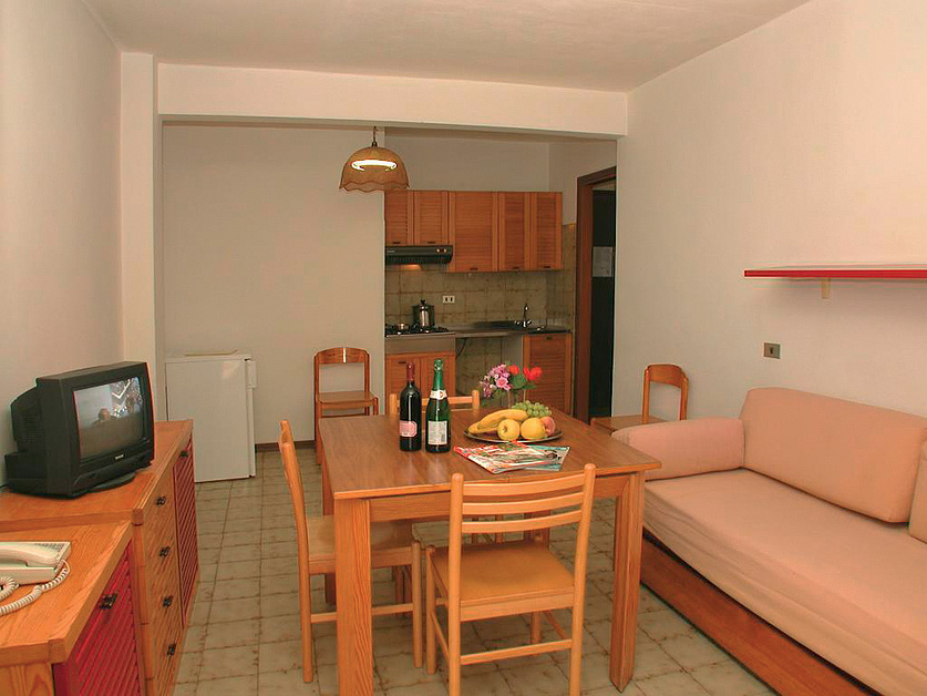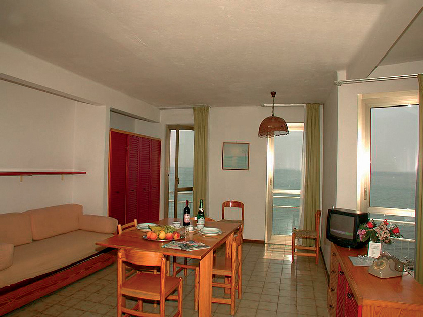 28 m² - obývací pokoj s kuchyňským koutem a rozkládacím gaučem pro 2 osoby a 1 rozkládacím lůžkem či křeslem pro 1 osobu, sociální zařízení se sprchou, balkon nebo francouzské okno s bočním výhledem na moře