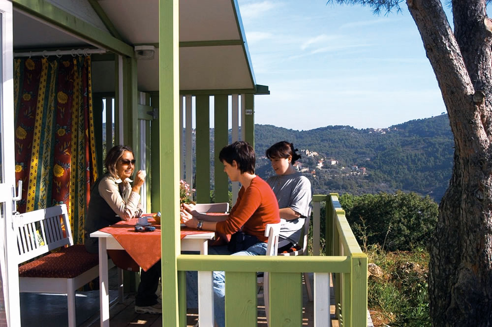 42 m² - ložnice s manželskou postelí, ložnice s 2 samostatnými lůžky, obývací pokoj s rozkládacím gaučem a kuchyňským koutem, sociální zařízení, veranda či předzahrádka