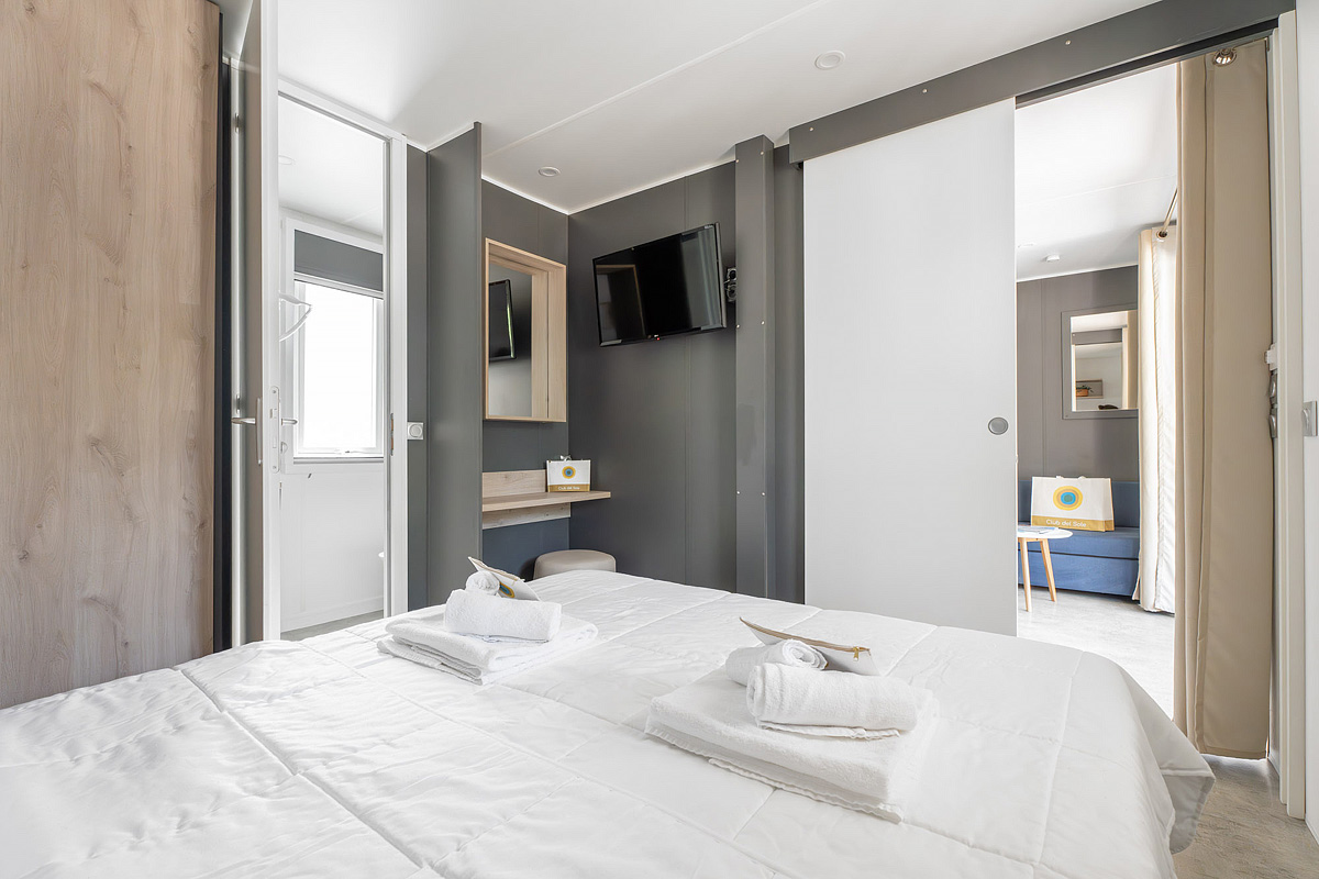 30 m² - ložnice s manželskou postelí, ložnice se 2 samostatnými lůžky a 1 zavěšeným lůžkem (doporučujeme pro děti do 12 let), obytná část s kuchyňským koutem, 2 sociální zařízení se sprchou, krytá terasa