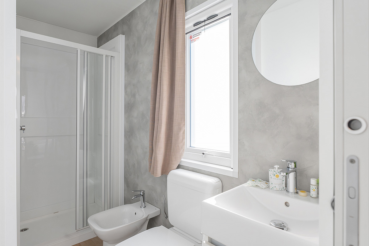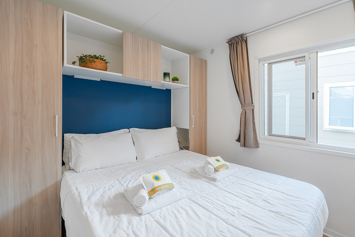 34 m² - ložnice s manželskou postelí, ložnice s 1 lůžkem, vysouvacím lůžkem a 1 zavěšeným lůžkem, obytná část s kuchyňským koutem, sociální zařízení se sprchou, krytá dřevěná terasa