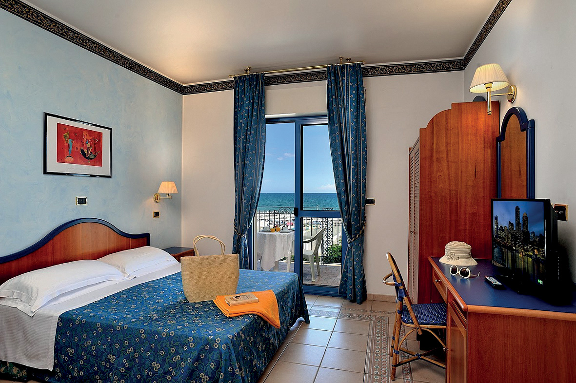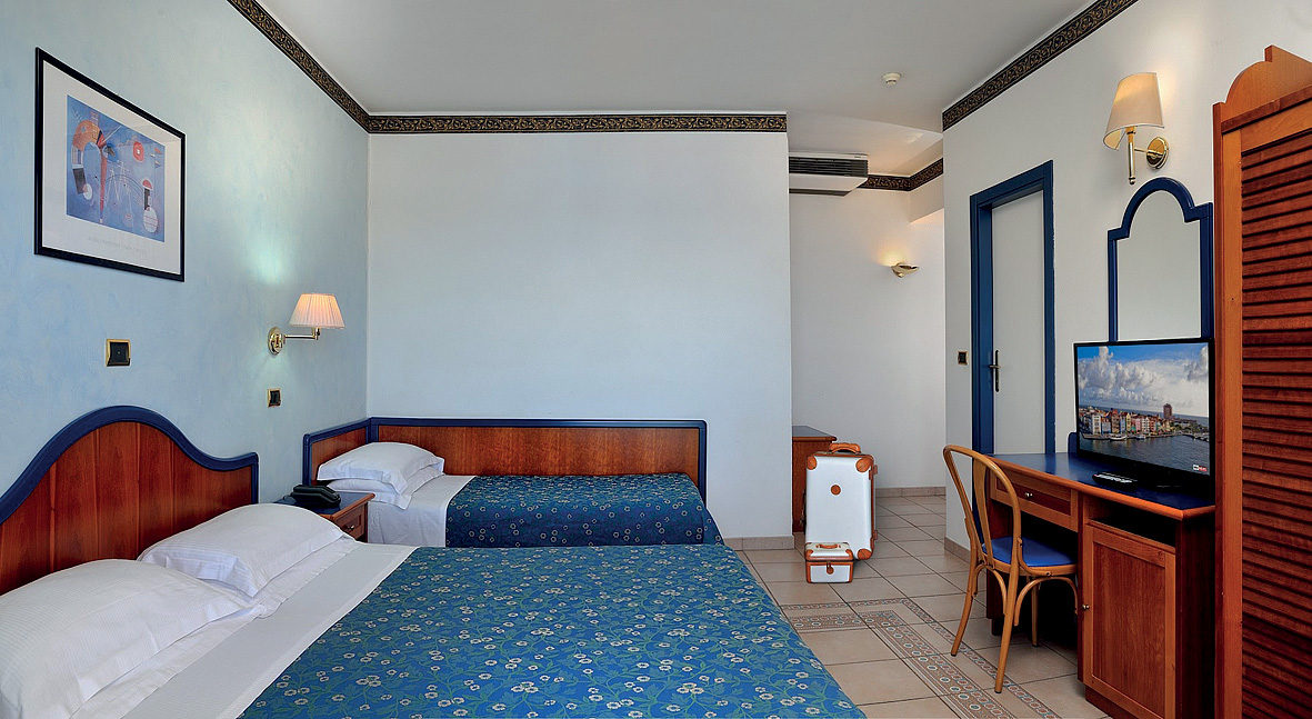 pokoj s manželskou postelí či 2 samostatnými lůžky, sociální zařízení se sprchou, balkon s bočním výhledem na moře; 3. a 4. lůžko formou přistýlky či palandy