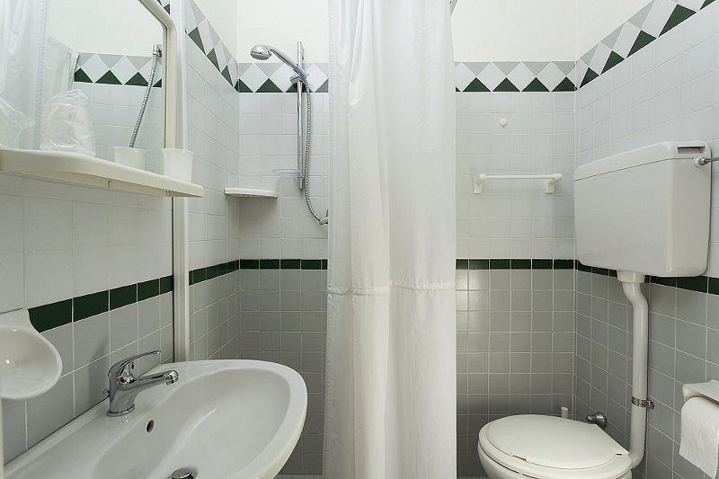 pokoj s jedním lůžkem, sociální zařízení se sprchou se závěsem, malý balkon