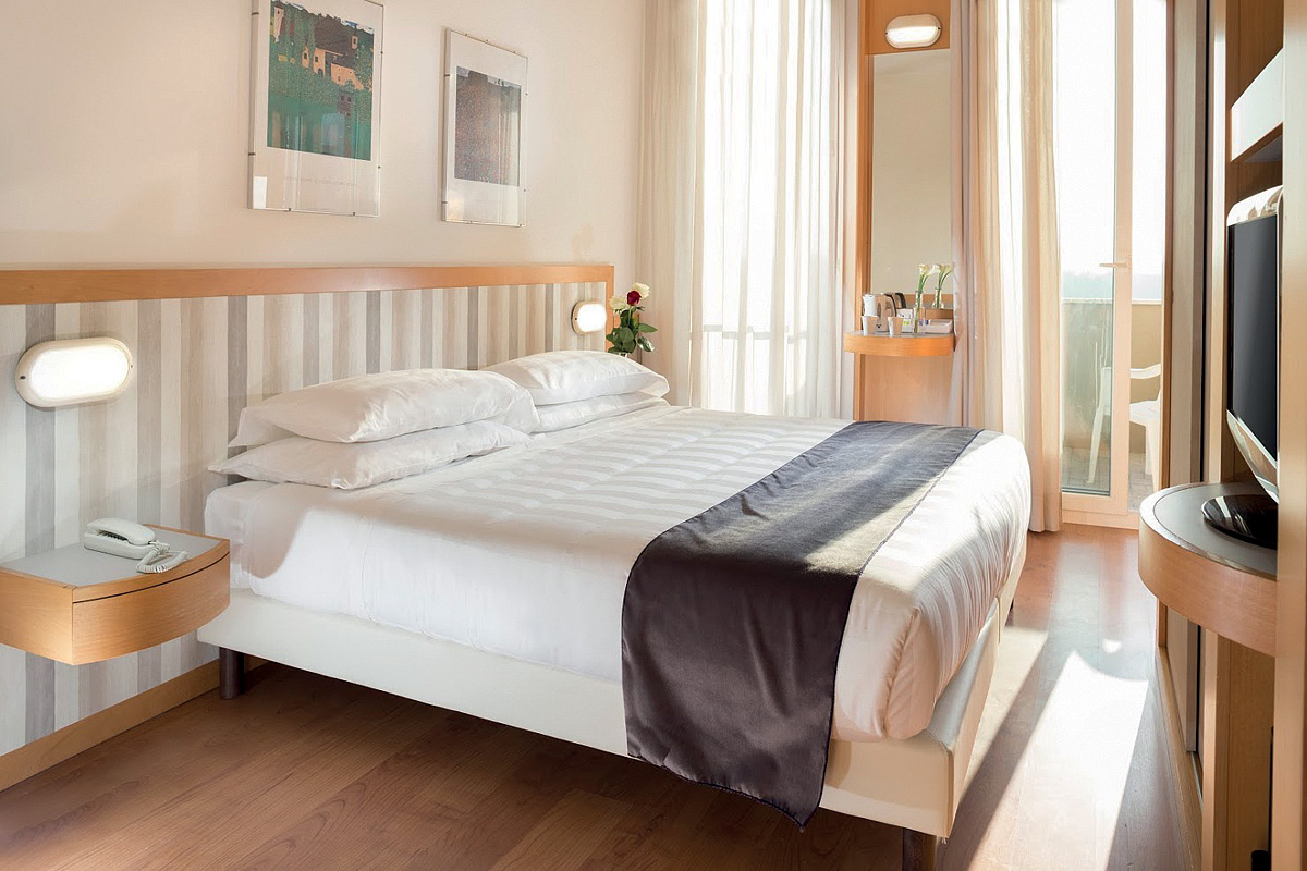 pokoj s manželskou postelí či 2 samostatnými lůžky, sociální zařízení se sprchou, balkon s přímým výhledem na moře; 3. a 4. lůžko zpravidla formou atypického gauče rozložitelného na palandu