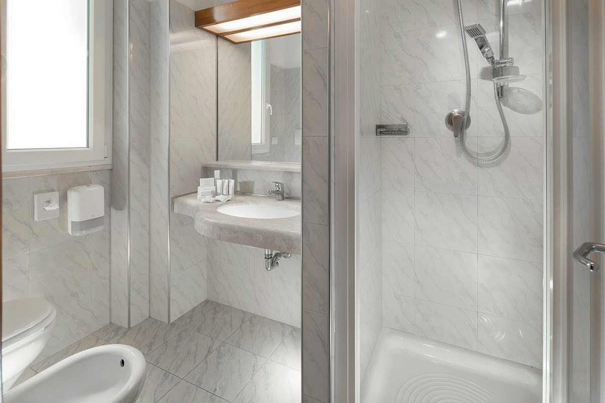 pokoj s manželskou postelí či 2 samostatnými lůžky, sociální zařízení se sprchou, balkon s bočním výhledem na moře; 3. a 4. lůžko zpravidla formou atypického gauče rozložitelného na palandu