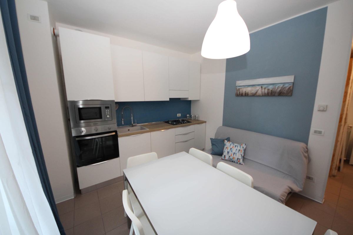 1 ložnice s manželskou postelí, 1 ložnice s 2 samostatnými lůžky, obývací pokoj s kuchyňským koutem a příp. rozkládacím gaučem pro 1 osob, sociální zařízení se sprchou, balkon či terasa