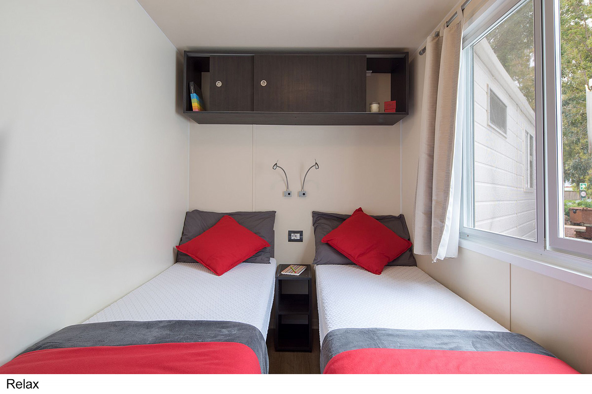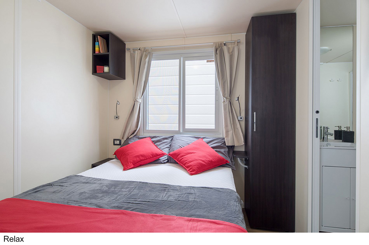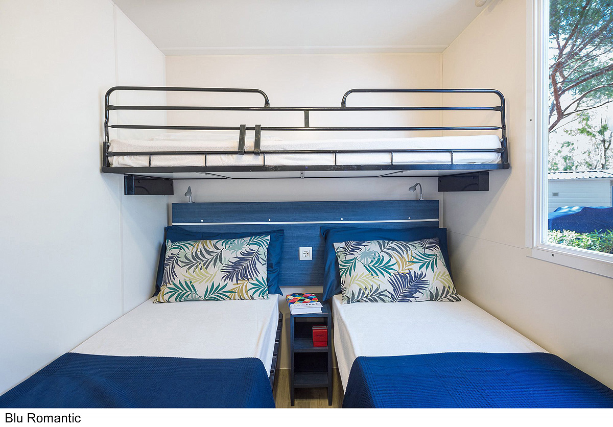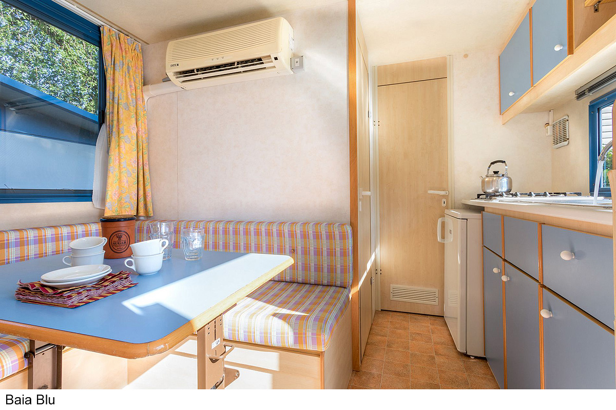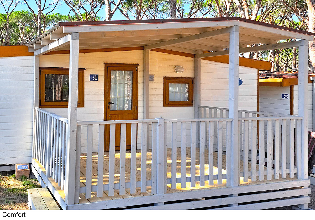 33 m² - ložnice s manželskou postelí, 2 ložnice se 2 samostatnými lůžky, obytná část s kuchyňským koutem, sociální zařízení se sprchou, krytá dřevěná terasa; některé mobilhomy mají navíc ještě samostatné WC; vzdálenost od pláže cca 150-200 m