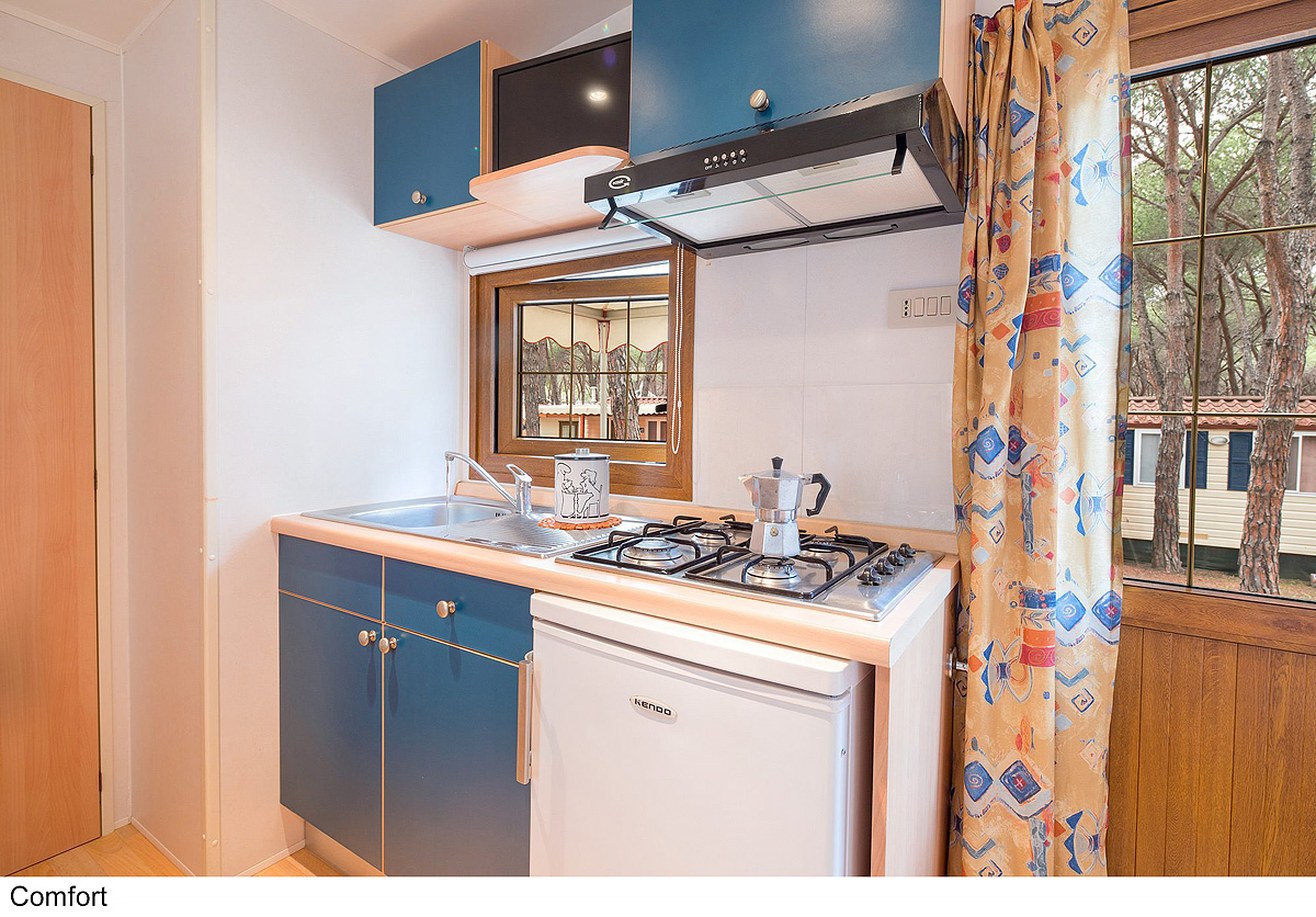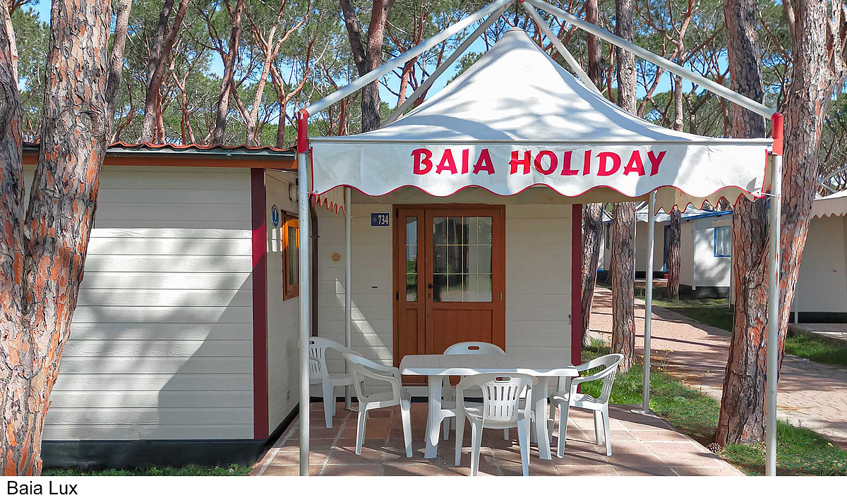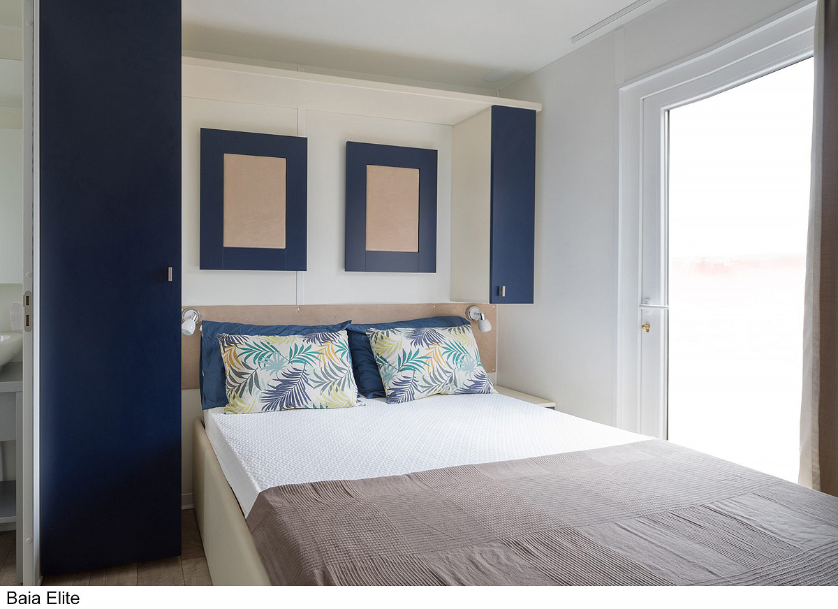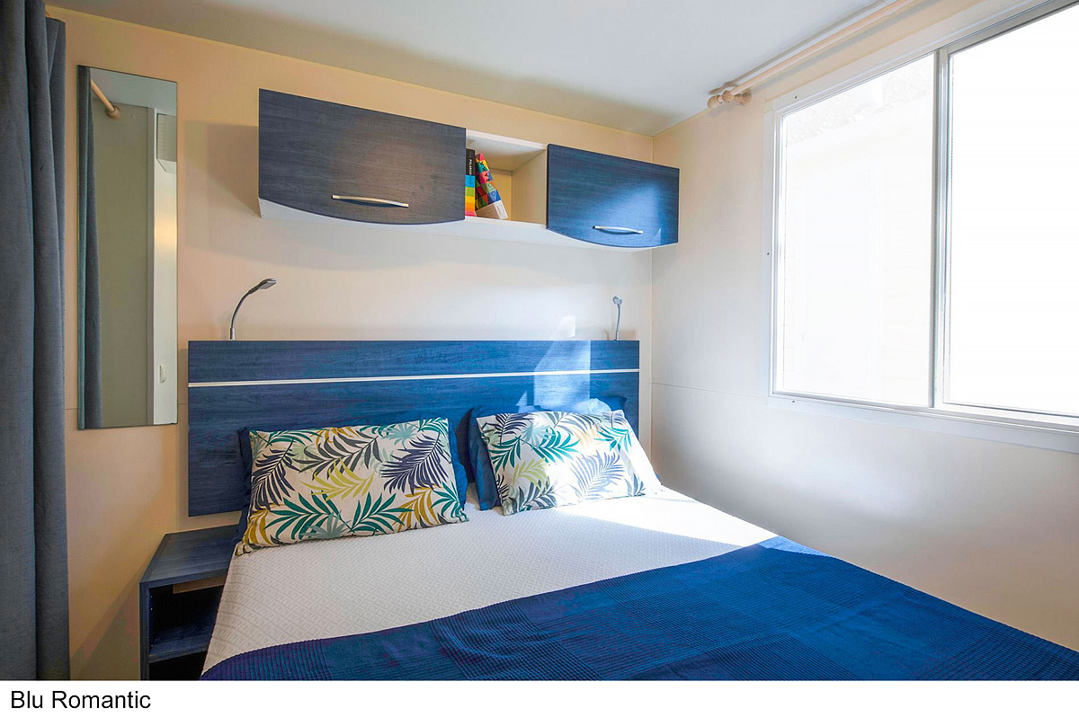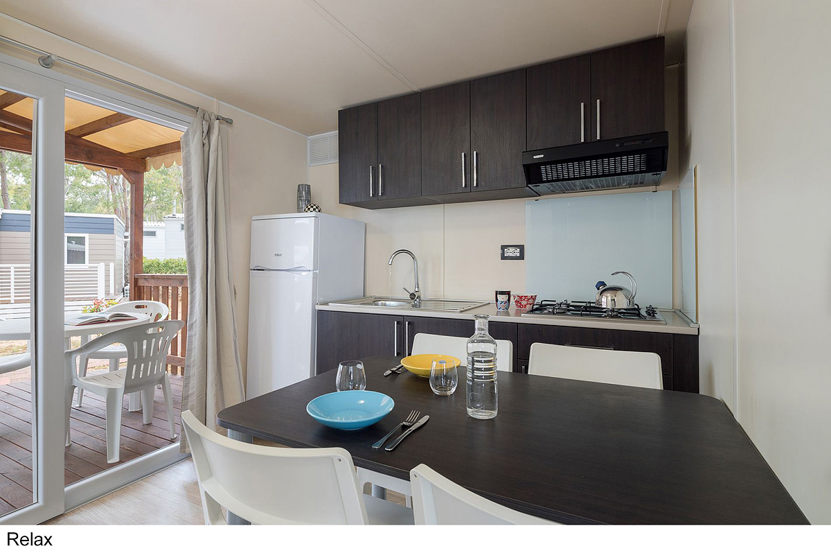 33 m² - ložnice s manželskou postelí, 2 ložnice se 2 samostatnými lůžky, obytná část s kuchyňským koutem, sociální zařízení se sprchou, krytá dřevěná terasa; některé mobilhomy mají navíc ještě samostatné WC; vzdálenost od pláže cca 150-200 m