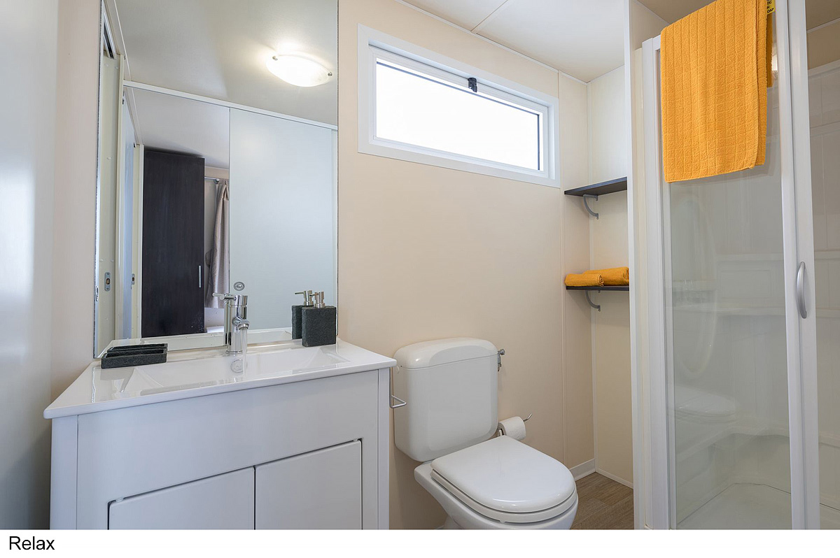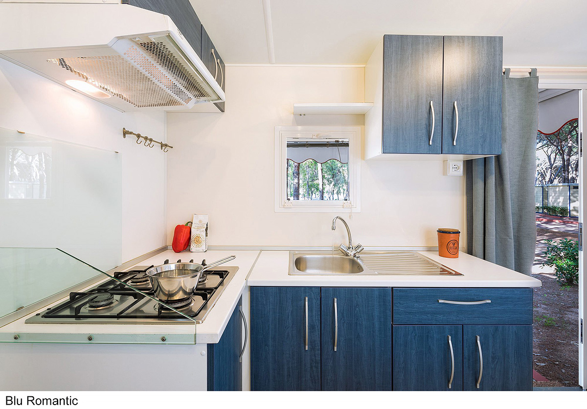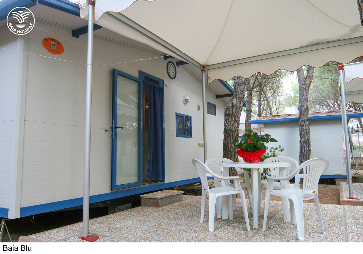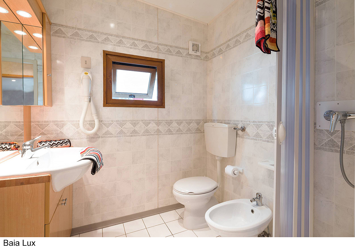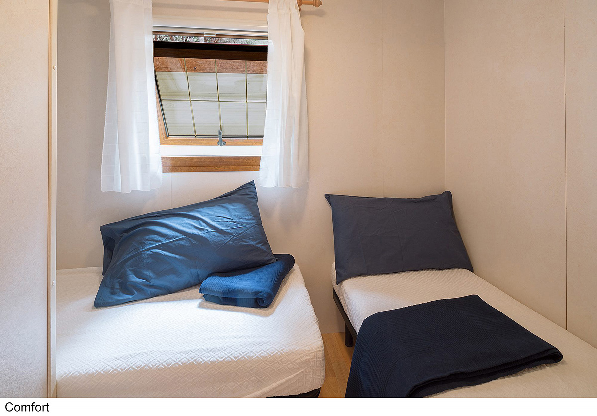 33 m² - ložnice s manželskou postelí, 2 ložnice se 2 samostatnými lůžky, obytná část s kuchyňským koutem, sociální zařízení se sprchou, krytá dřevěná terasa; některé mobilhomy mají navíc ještě samostatné WC; vzdálenost od pláže cca 150-200 m