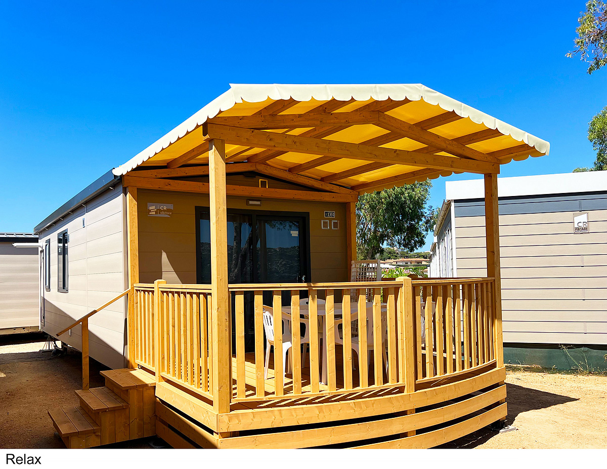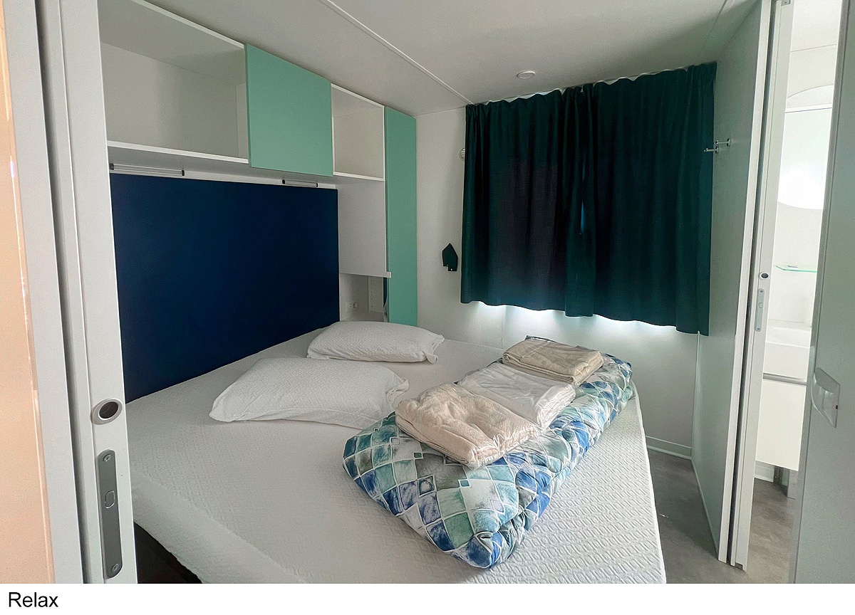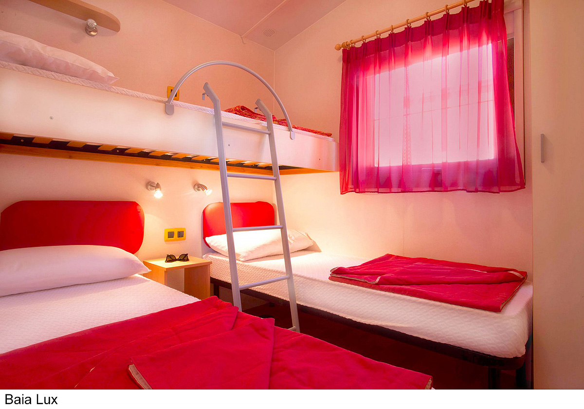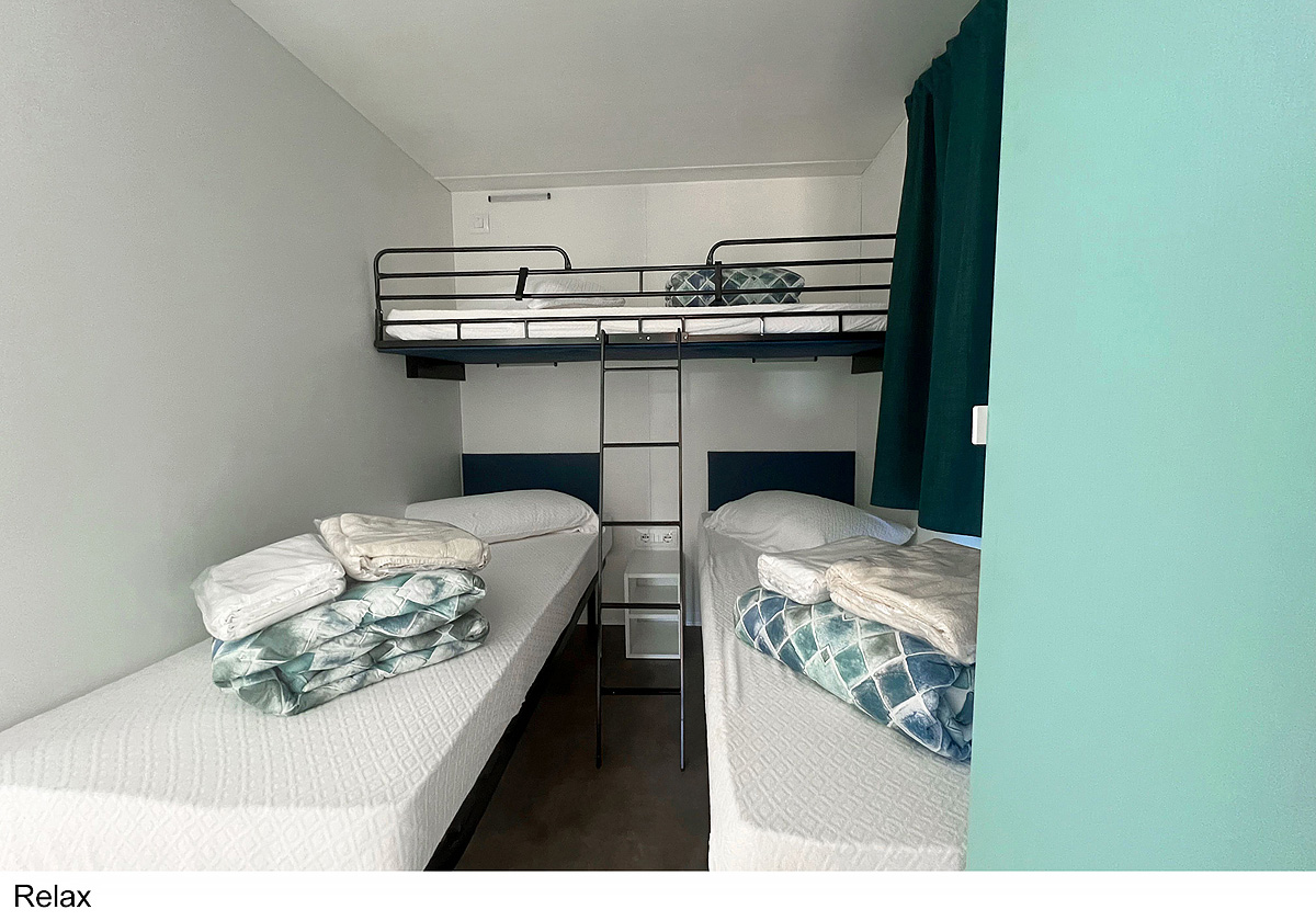 25 m² - ložnice s manželskou postelí, ložnice se 2 samostatnými lůžky a 1 zavěšeným lůžkem (pro dítě do 150 cm a 60 kg), obytná část s kuchyňským koutem, sociální zařízení se sprchou, zastíněná a uzavíratelná dřevěná terasa; maximální obsazenost 4 dospělí a 1 dítě do nedovršených 12 let; vzdálenost od pláže 270-400 m