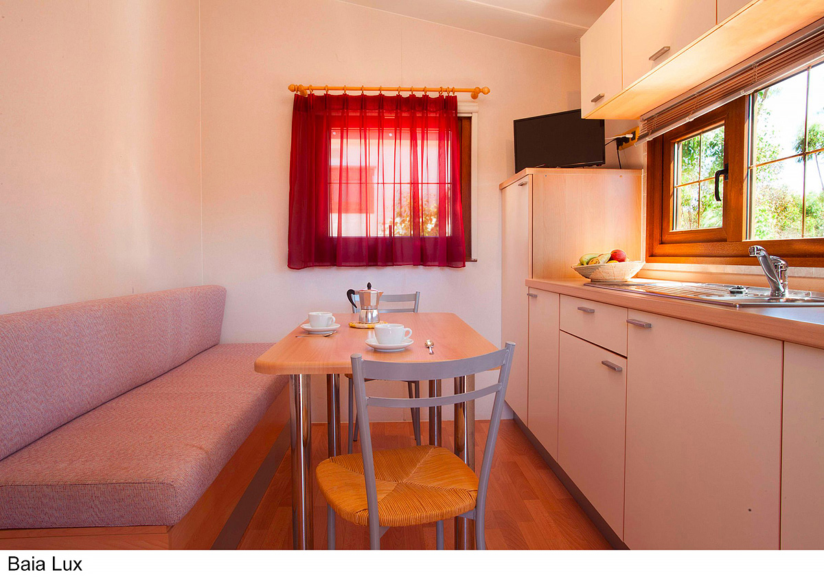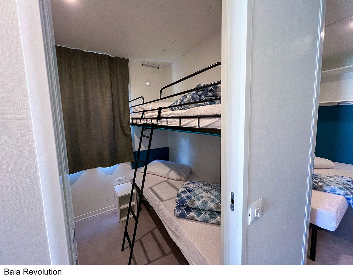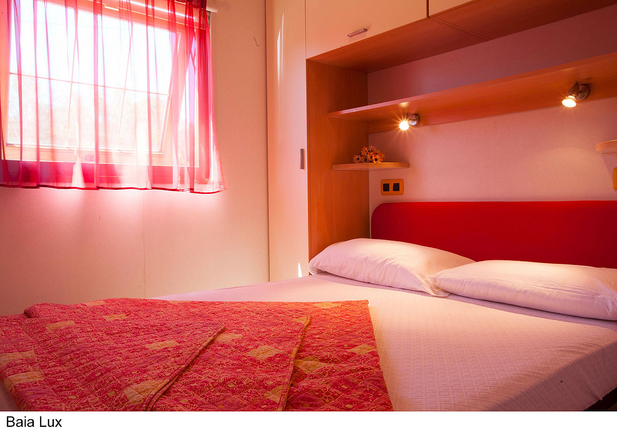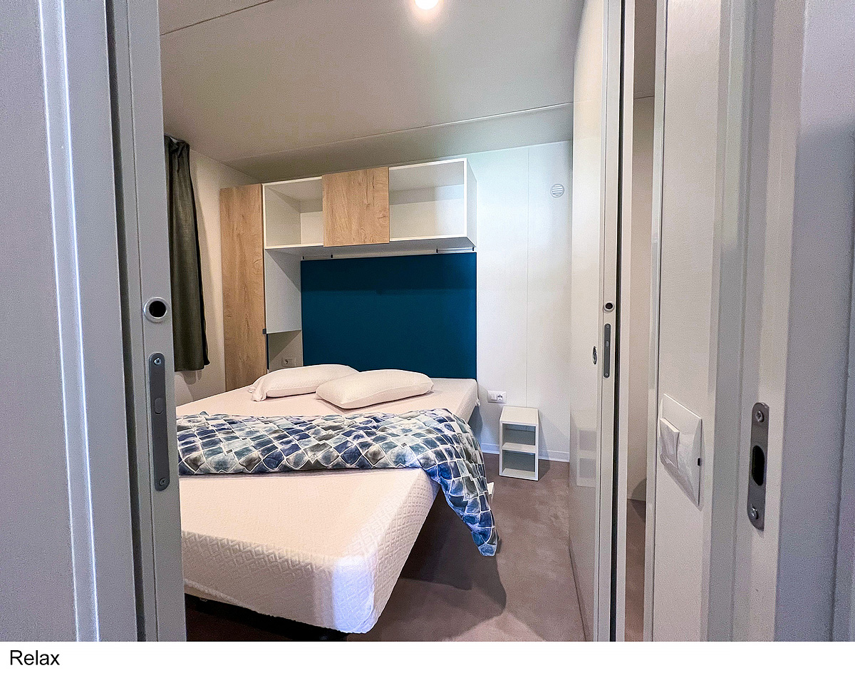 25 m² - ložnice s manželskou postelí, ložnice se 2 samostatnými lůžky a 1 zavěšeným lůžkem (pro dítě do 150 cm a 60 kg), obytná část s kuchyňským koutem, sociální zařízení se sprchou, zastíněná a uzavíratelná dřevěná terasa; maximální obsazenost 4 dospělí a 1 dítě do nedovršených 12 let; vzdálenost od pláže 270-400 m