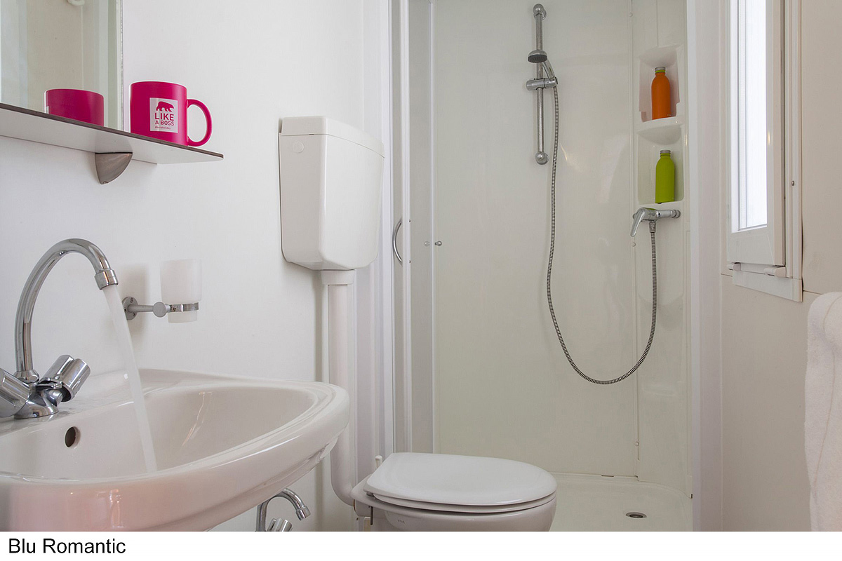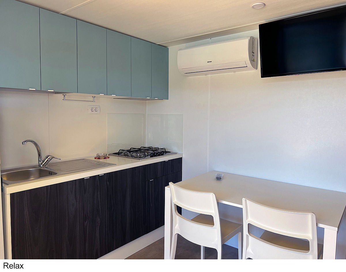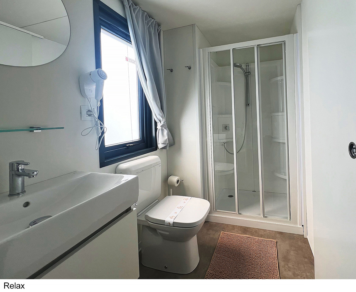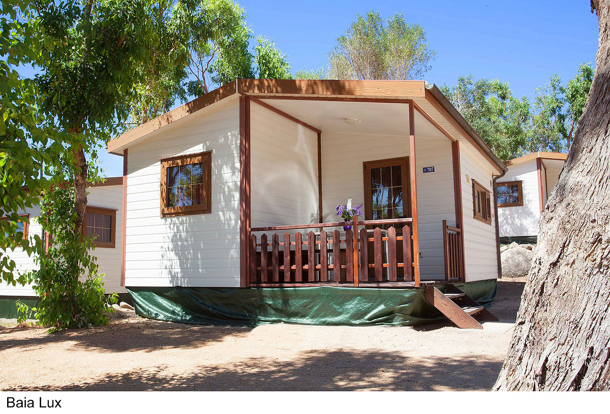 25 m² - ložnice s manželskou postelí, ložnice se 2 samostatnými lůžky a 1 zavěšeným lůžkem (pro dítě do 150 cm a 60 kg), obytná část s kuchyňským koutem, sociální zařízení se sprchou, zastíněná a uzavíratelná dřevěná terasa; maximální obsazenost 4 dospělí a 1 dítě do nedovršených 12 let; vzdálenost od pláže 270-400 m