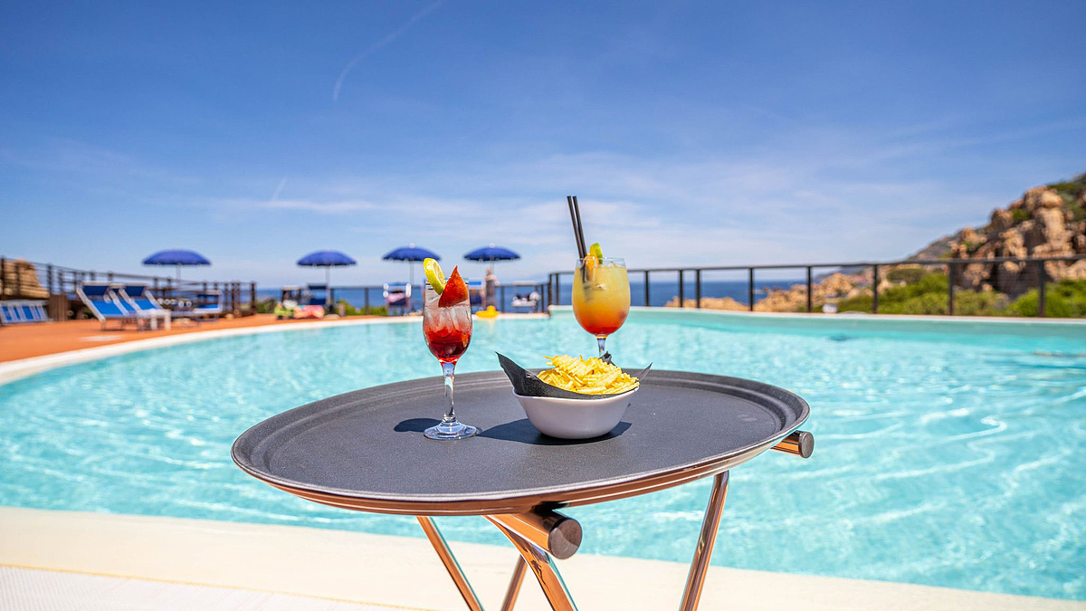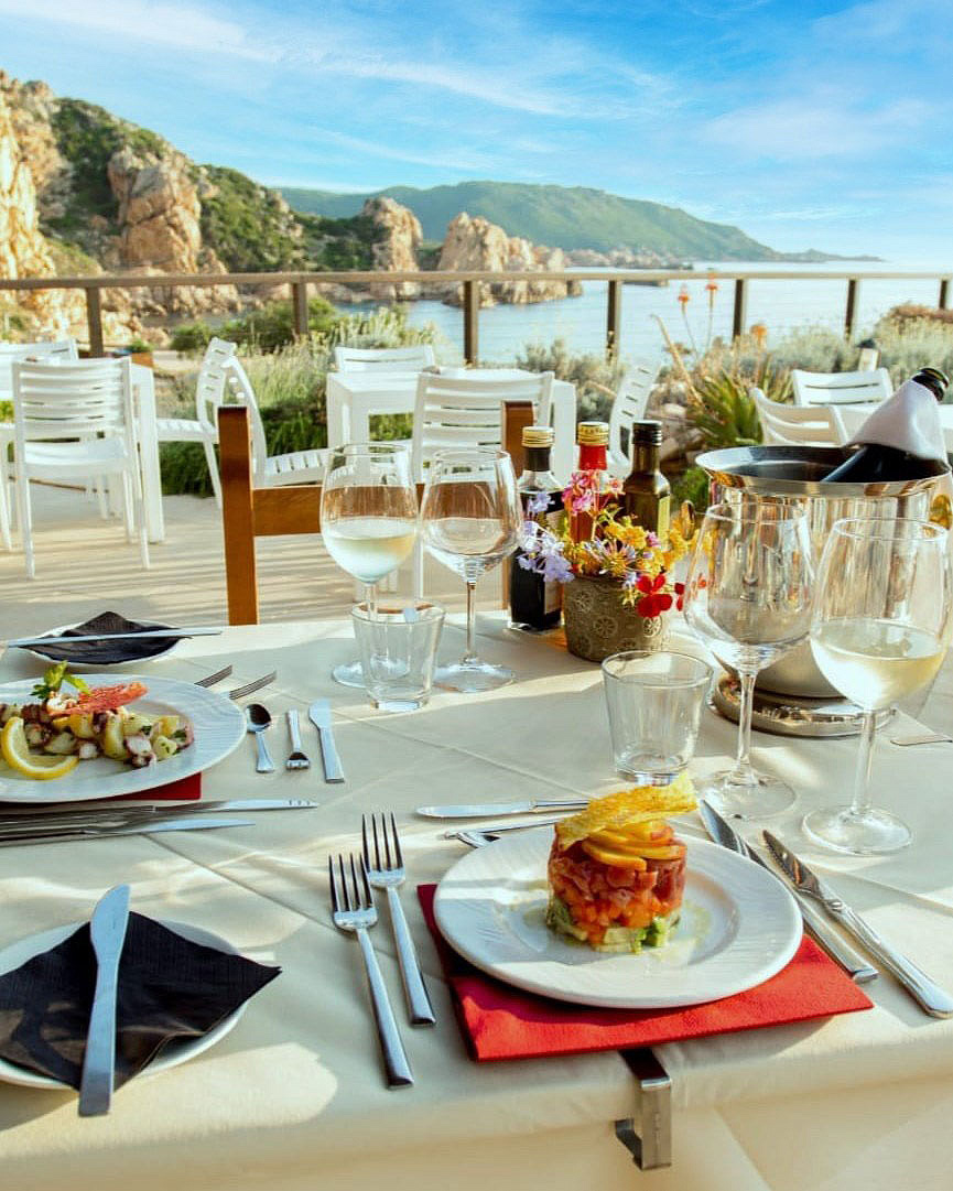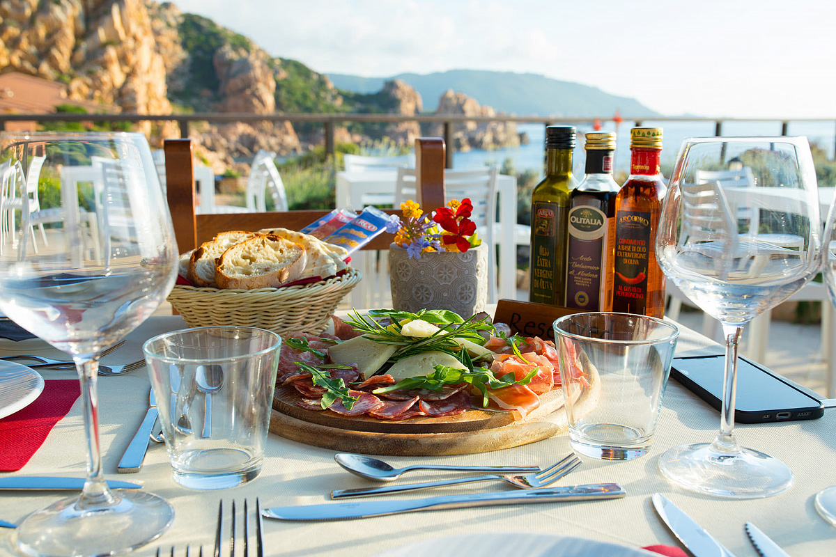 servírované menu s výběrem ze 2 teplých či studených předkrmů, 2 hlavních jídel, přílohy, dezert; nápoje za poplatek, v případě tematických večerů pak i večeře zaměřená na ryby, sardskou kuchyni či jiné dle šéfkuchaře