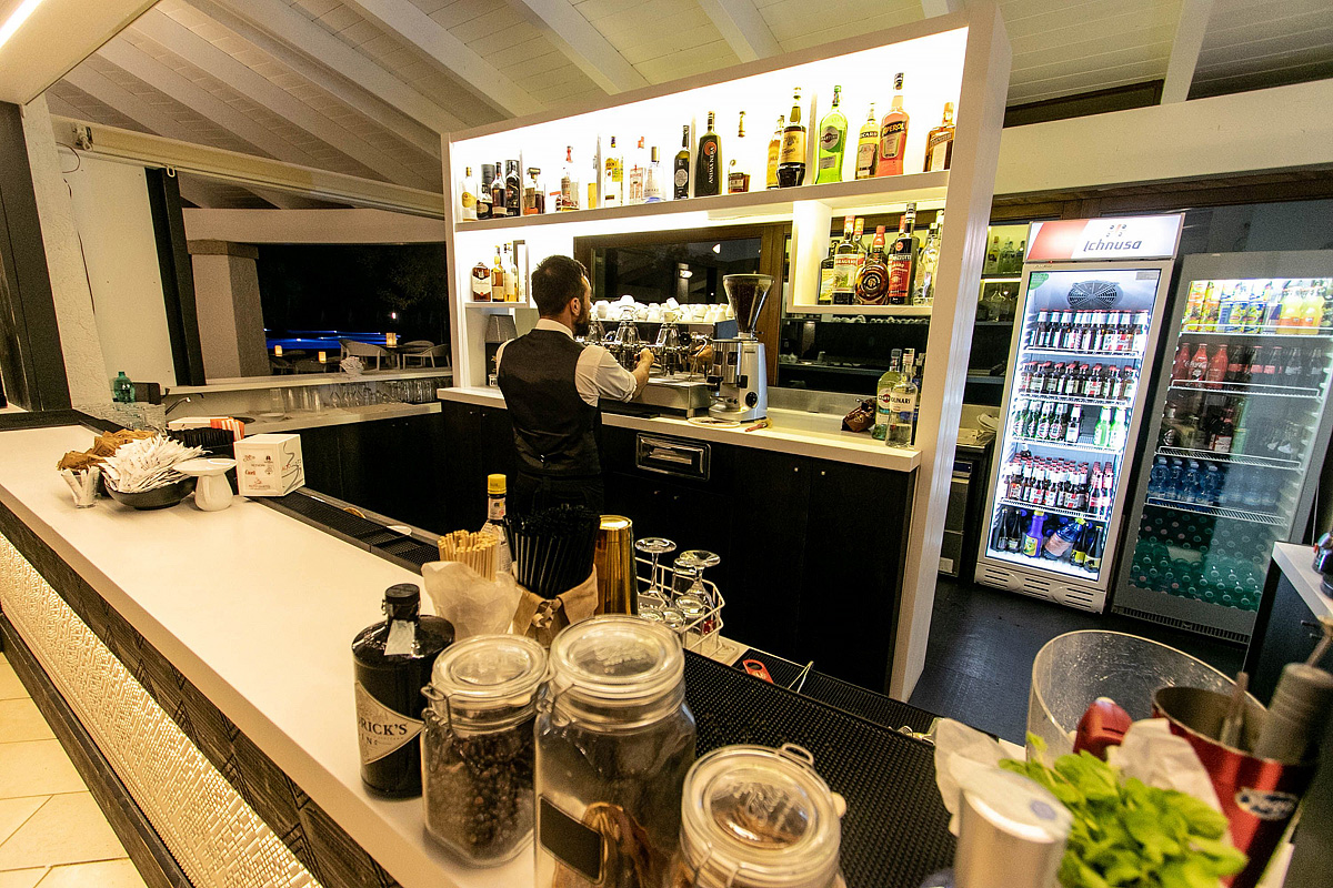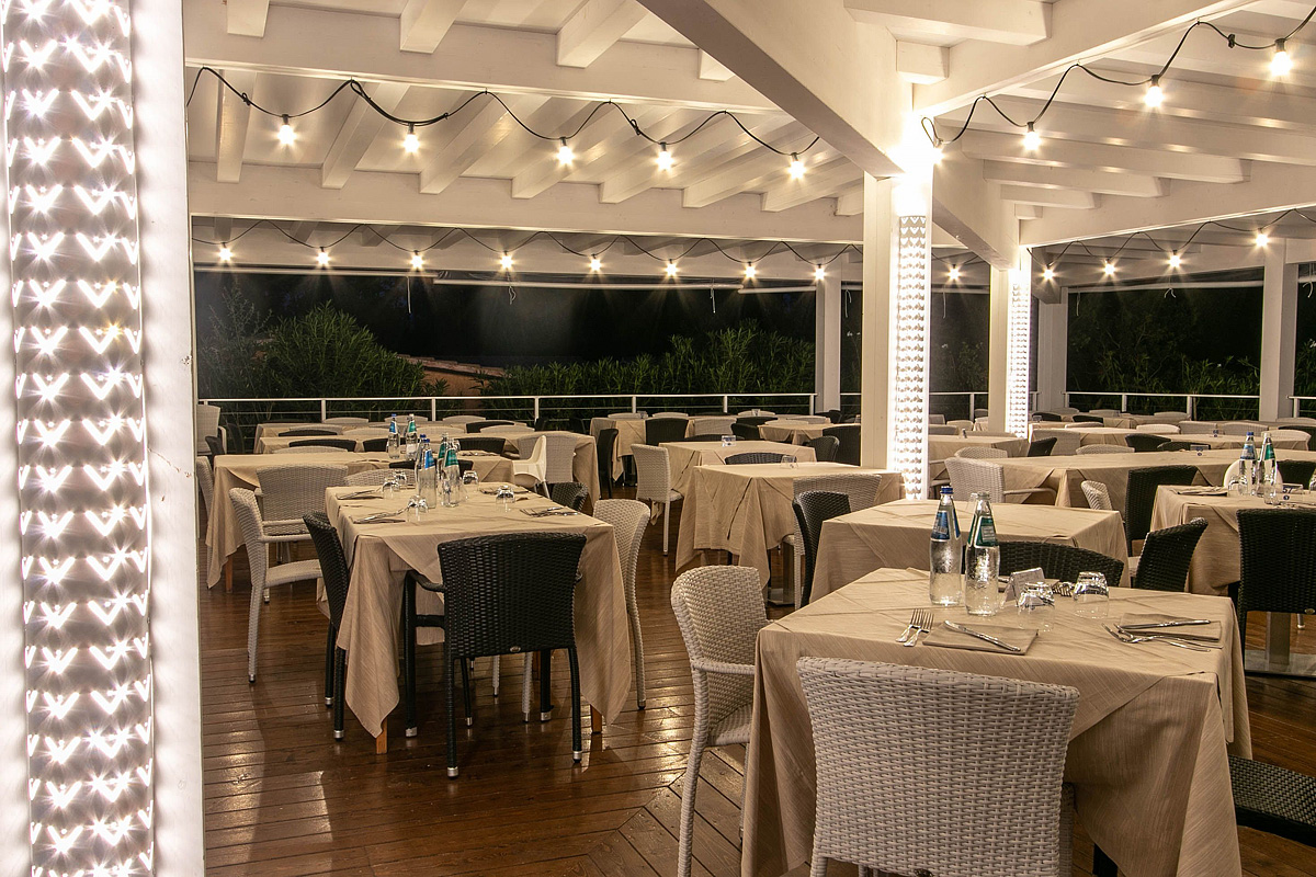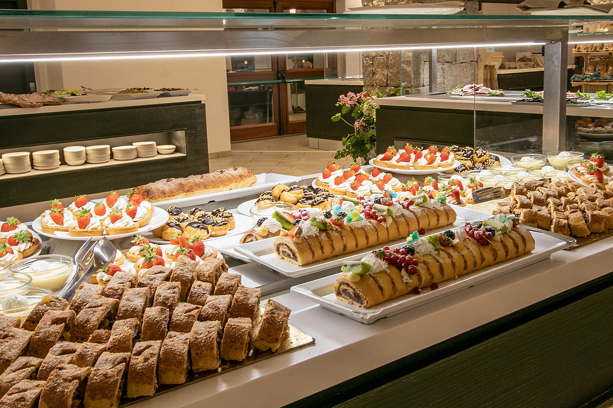 formou bufetu s výběrem ze 2 až 4 teplých či studených předkrmů, 2 až 3 hlavních jídel, přílohy, saláty, ovoce, dezerty, voda k jídlům v ceně; ostatní nápoje za poplatek, v případě tematických večerů pak i večeře zaměřená na ryby, sardskou kuchyni či jiné dle šéfkuchaře