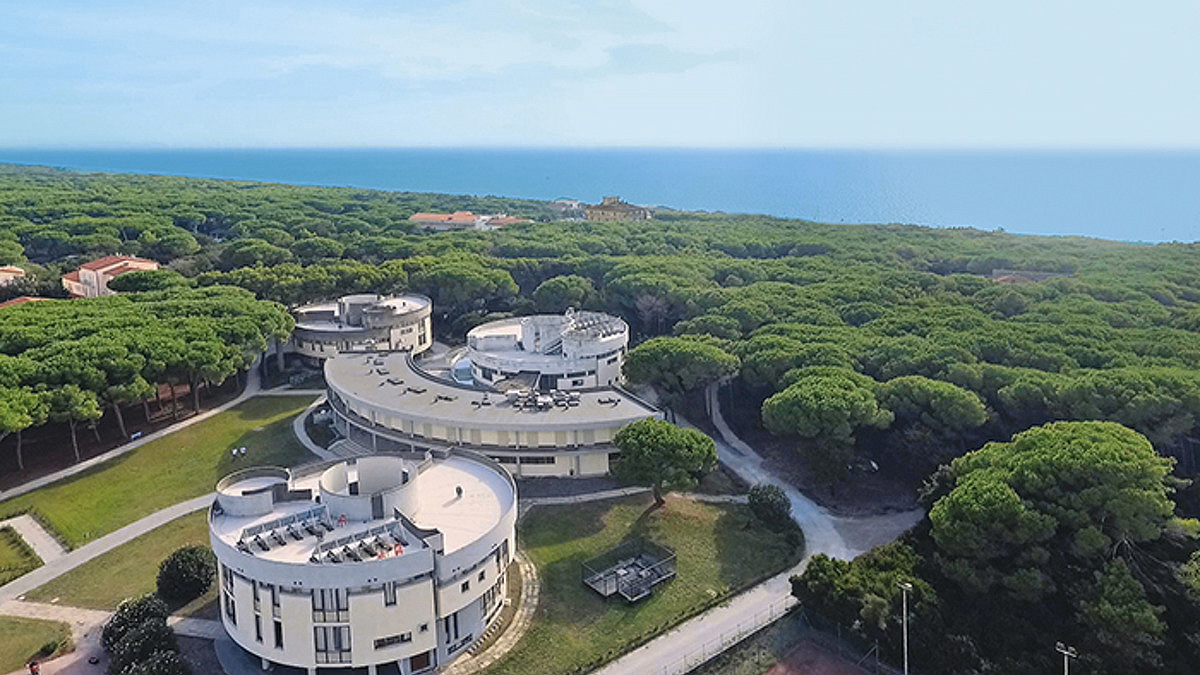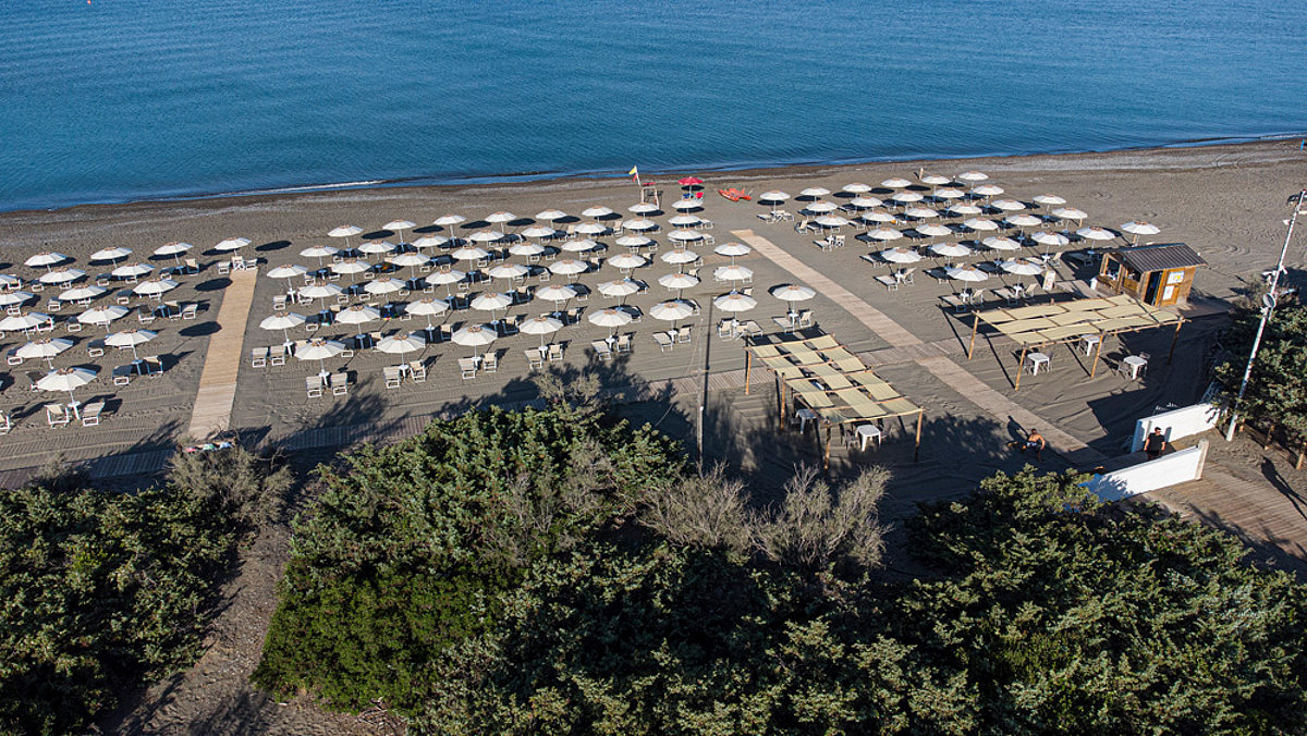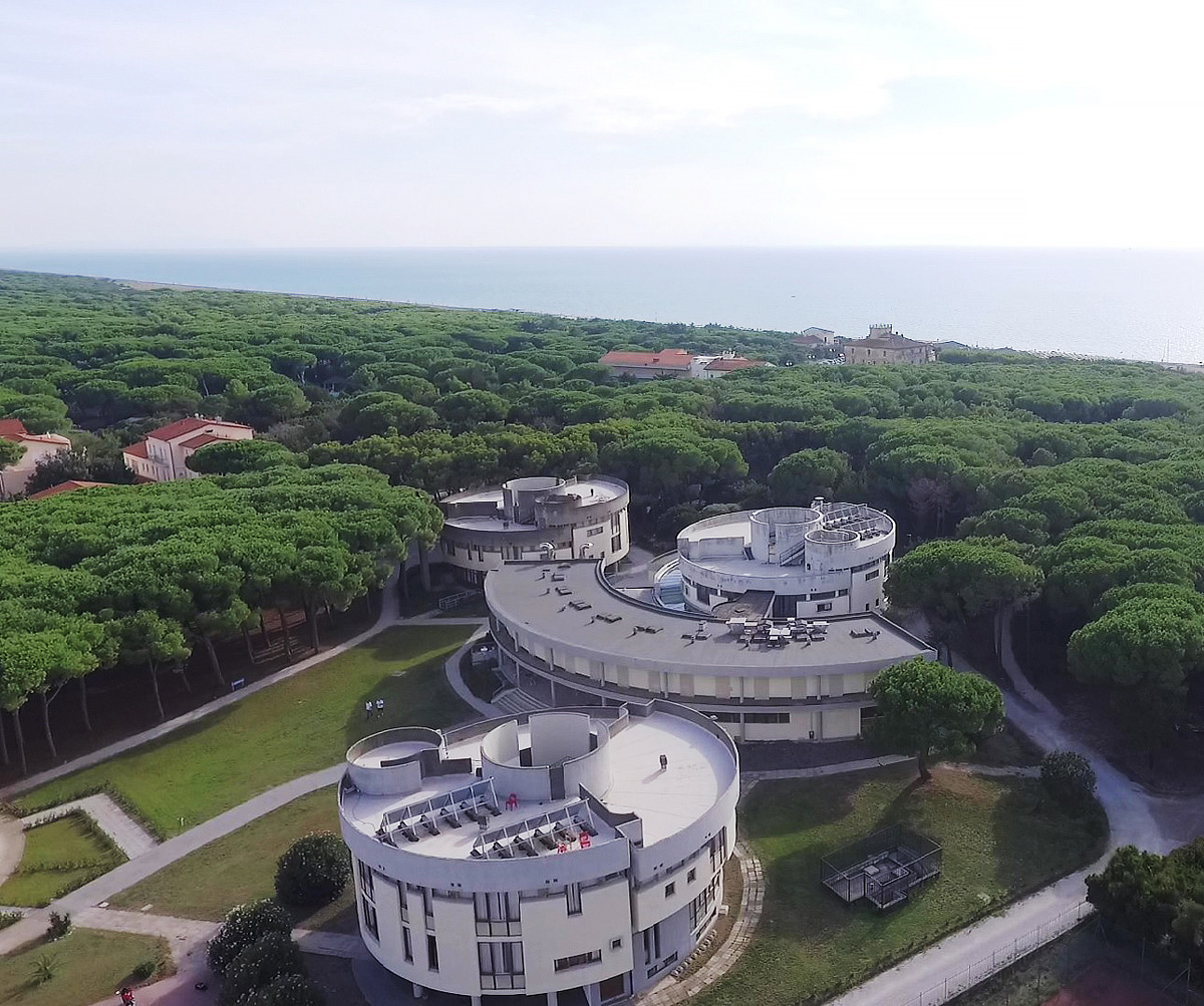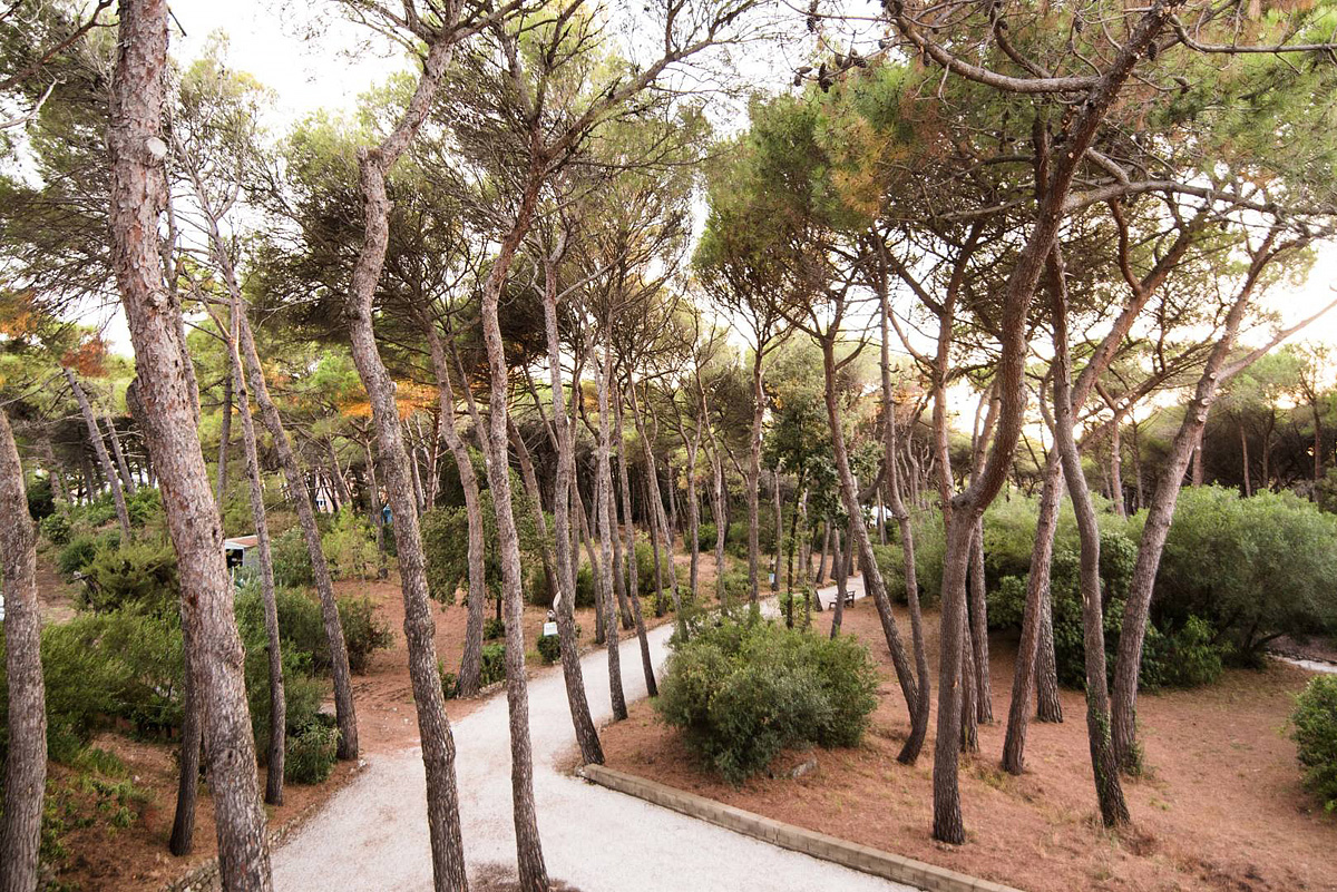netradiční hotel obklopený vlastním borovým hájem dosahujícím až k pláži
