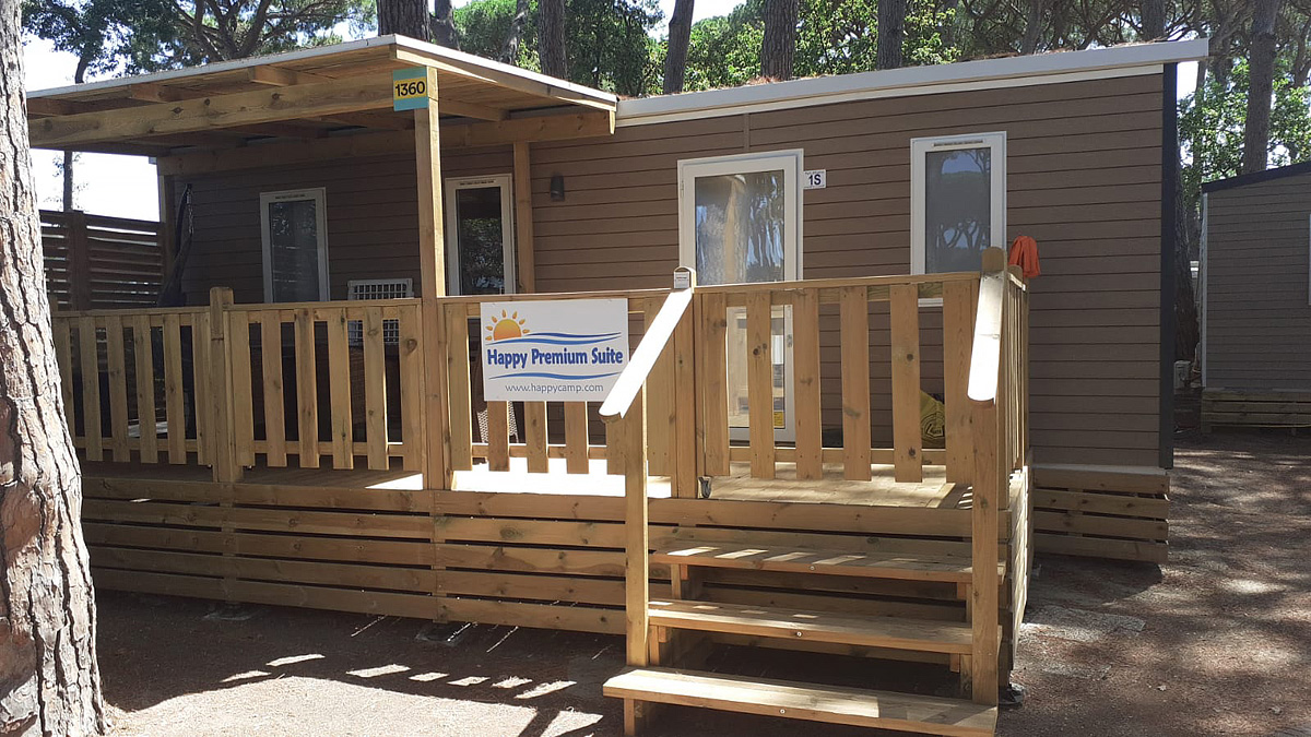 24 m² - ložnice s manželskou postelí, ložnice se 2 lůžky a 1 zavěšeným lůžkem (pro dítě do 150 cm a 60 kg), obývací pokoj s kuchyňským koutem a lavicí přestavitelnou na lůžko, sociální zařízení se sprchou, krytá terasa