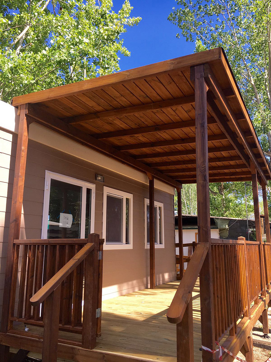 24 m² - ložnice s manželskou postelí, ložnice se 2 lůžky a zavěšeným lůžkem (pro dítě do nedovršených 12 let), obytná část s kuchyňským koutem a lavicí přestavitelnou na lůžko, sociální zařízení se sprchou, dřevěná terasa; doporučeno pro 4 dospělé osoby a 2 děti