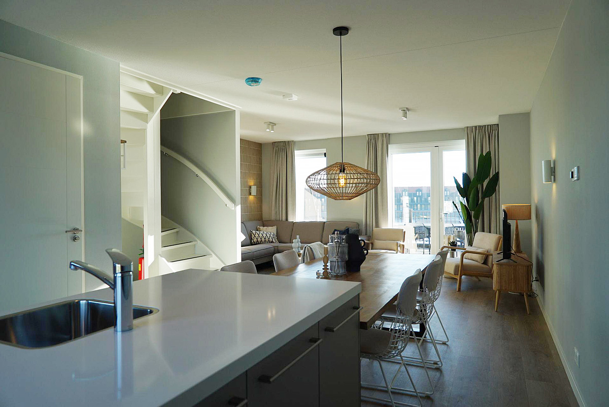 85 m² - prostorný dvoupatrový apartmán, přízemí: obývací pokoj s kuchyňským koutem, terasa, 1. patro: 3 ložnice se 2 samostatnými lůžky typu boxpring, 2 sociální zařízení se sprchou, podlahové vytápění v přízemí, balkon s výhledy na přístav, max. obsazení 6 osob, 2 parkovací místa