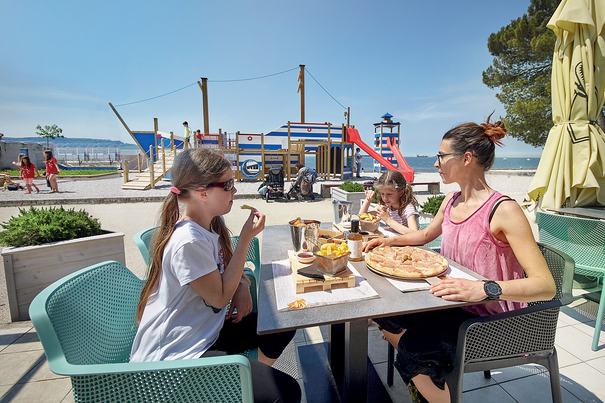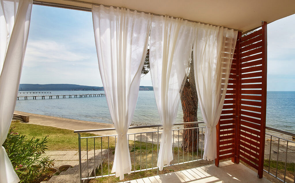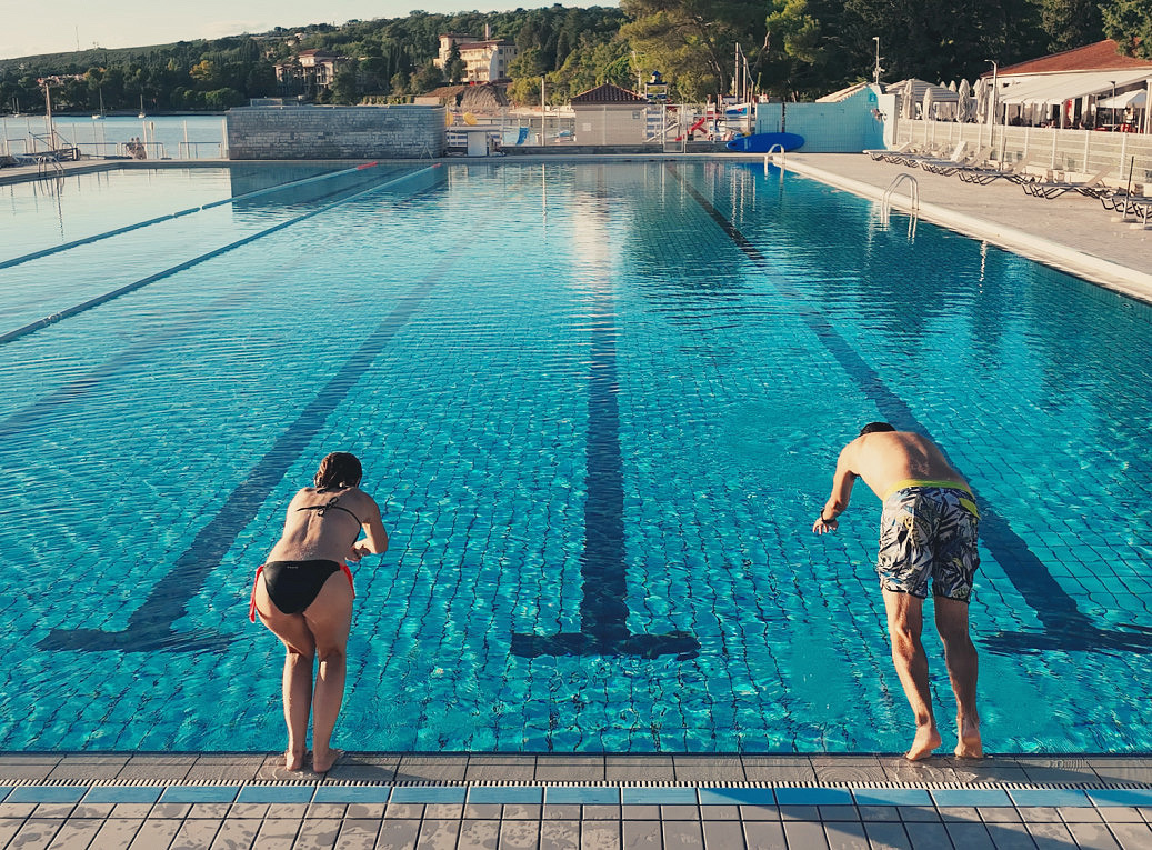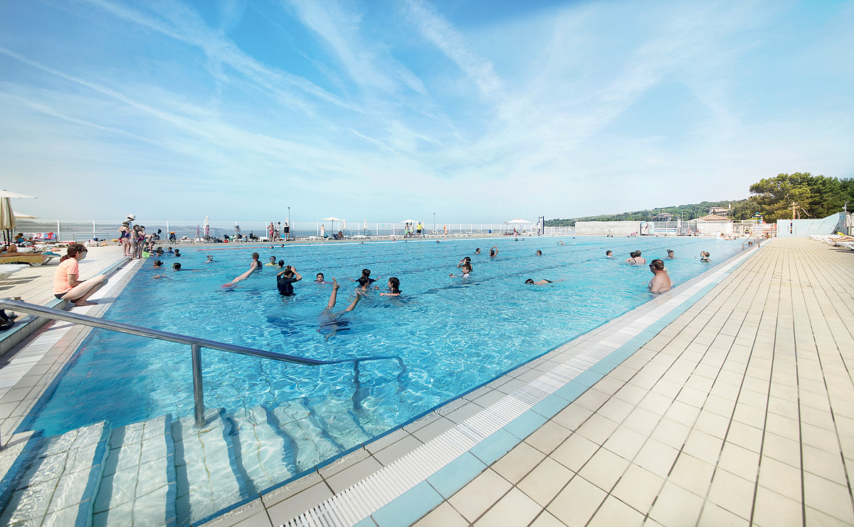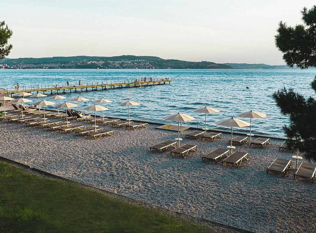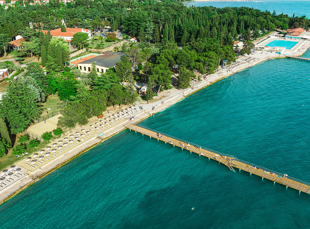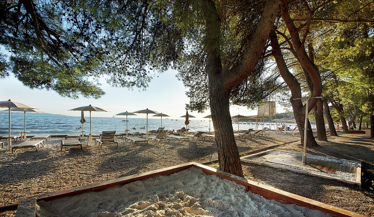 Venkovní aktivity: venkovní olympijský bazén s mořskou vodou ležící přímo u pobřeží (otevřen cca. od 15.6. do 15.9. dle počasí), lehátka u krytého bazénu volně k dispozici (včetně terasy), prostorná pláž s moly a betonovými platy, ale i travnatá stinná zákoutí, oblázkové mořské dno a bezpečná mělká voda jsou ideální pro děti na hraní ve vodě, lehátka* a slunečníky* na pláži i u venkovního bazénu, vodní plovoucí park pro děti s nafukovacími prvky*, písečné hřiště na plážový volejbal*, minigolf, kurt na stolní tenis, tenisové kurty*, minigolf (18 jamek)*, multifunkční sportovní hřiště*, vodní sporty na pláži (kajaky, šlapadla, atd.)* a potápění*, půjčovna kol*, jízda na koních*, stranou umístěná psí pláž (ovšem pobyt se psy povolen jen v některých kapacitách po předchozím vyžádání)